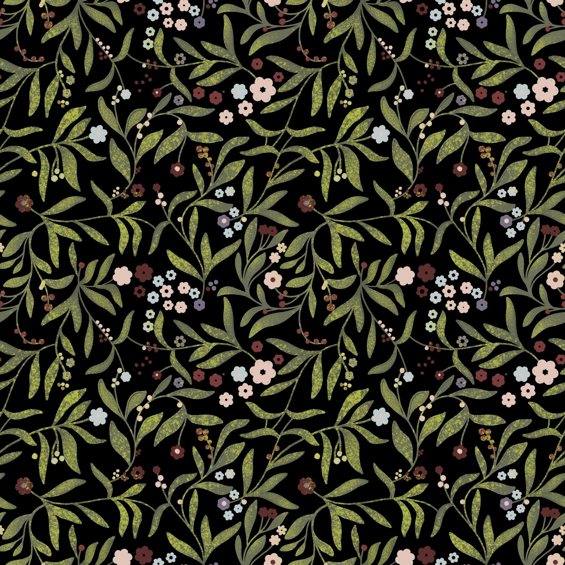 Escape into a realm of tranquil beauty with Floral Serenity a captivating wallpaper that whispers of peaceful meadows and moonlit gardens. Against a deep, grounding black backdrop, a delicate dance of textured olive-green leaves and miniature blooms unfolds. Hints of blush pink, soft blue, and muted burgundy flowers create a subtle, sophisticated palette, imbuing any space with a sense of calm and understated elegance. Each element is thoughtfully placed, creating a visual rhythm that is both pleasing to the eye and soothing to the soul. Perfect for bedrooms, living spaces, or even home offices, "Floral Serenity" offers a touch of natural charm and invites a moment of mindful reflection into your everyday life. This wallpaper transforms any room into a sanctuary, a haven where you can unwind and find solace in the simple beauty of nature.