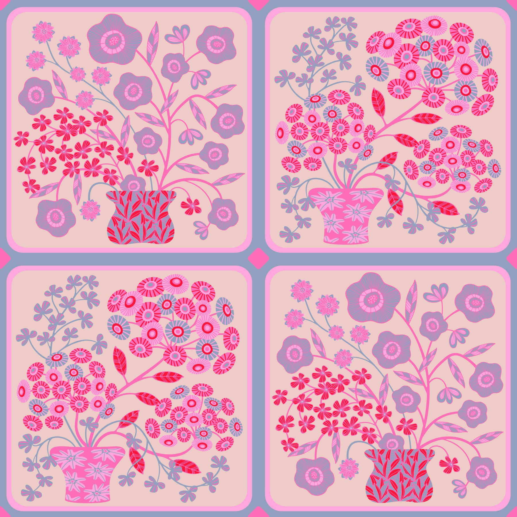 Floral bouquets in vases in square tiles inspired by Delft tiles (and Portuguese painted azulejos ceramic tiles too)! In my feminine Pretty In Pink colour palette: pastel pink, fuchsia, red, lavender purple and blush! Perfect for girls rooms and feminine spaces, and cottagecore living! This flower pattern design is also available in Other Colourways too. Original wallpaper pattern design by Jackie Tahara of UnBlink Studio.