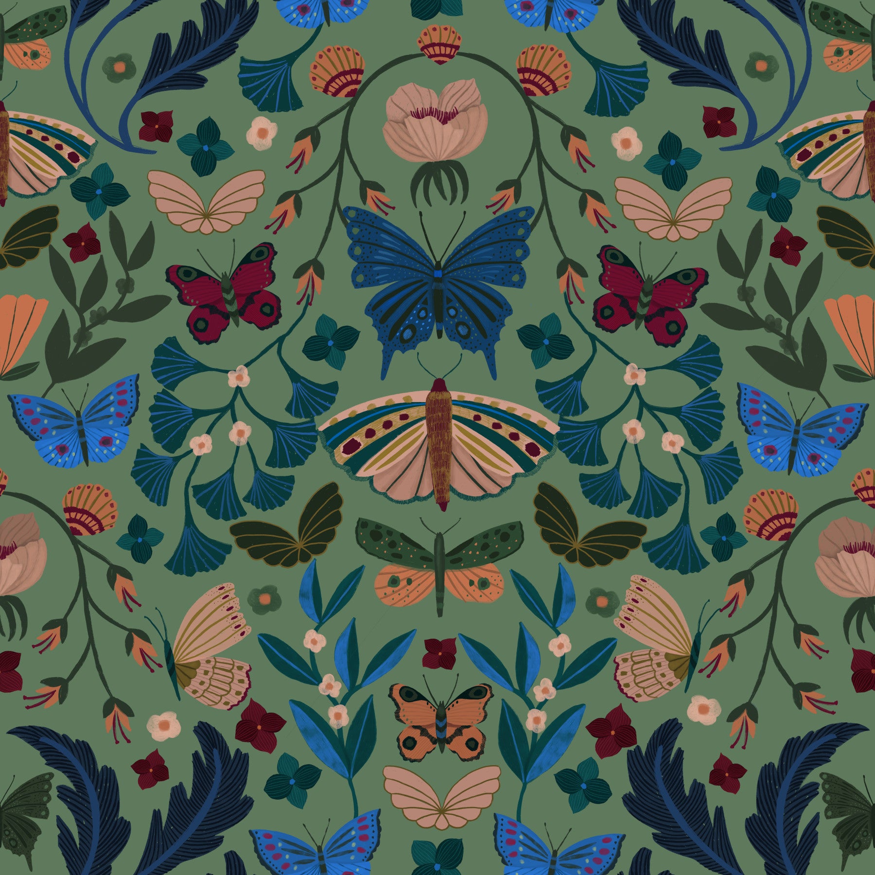 Enter the enchanting world of 'Fluttering Florals,' a wallpaper design where vibrant butterflies dance amongst a profusion of stylized blooms. Rich jewel tones of deep blues, burgundy, and ochre highlight the intricate details of each painted butterfly and flower, set against a calming sage green backdrop. The design's symmetrical composition creates a sense of balance and tranquility, making it a perfect choice for adding a touch of whimsical elegance to any space. Intricate floral motifs and the delicate flutter of butterflies bring a sense of lively serenity, ideal for creating a peaceful yet vibrant atmosphere.