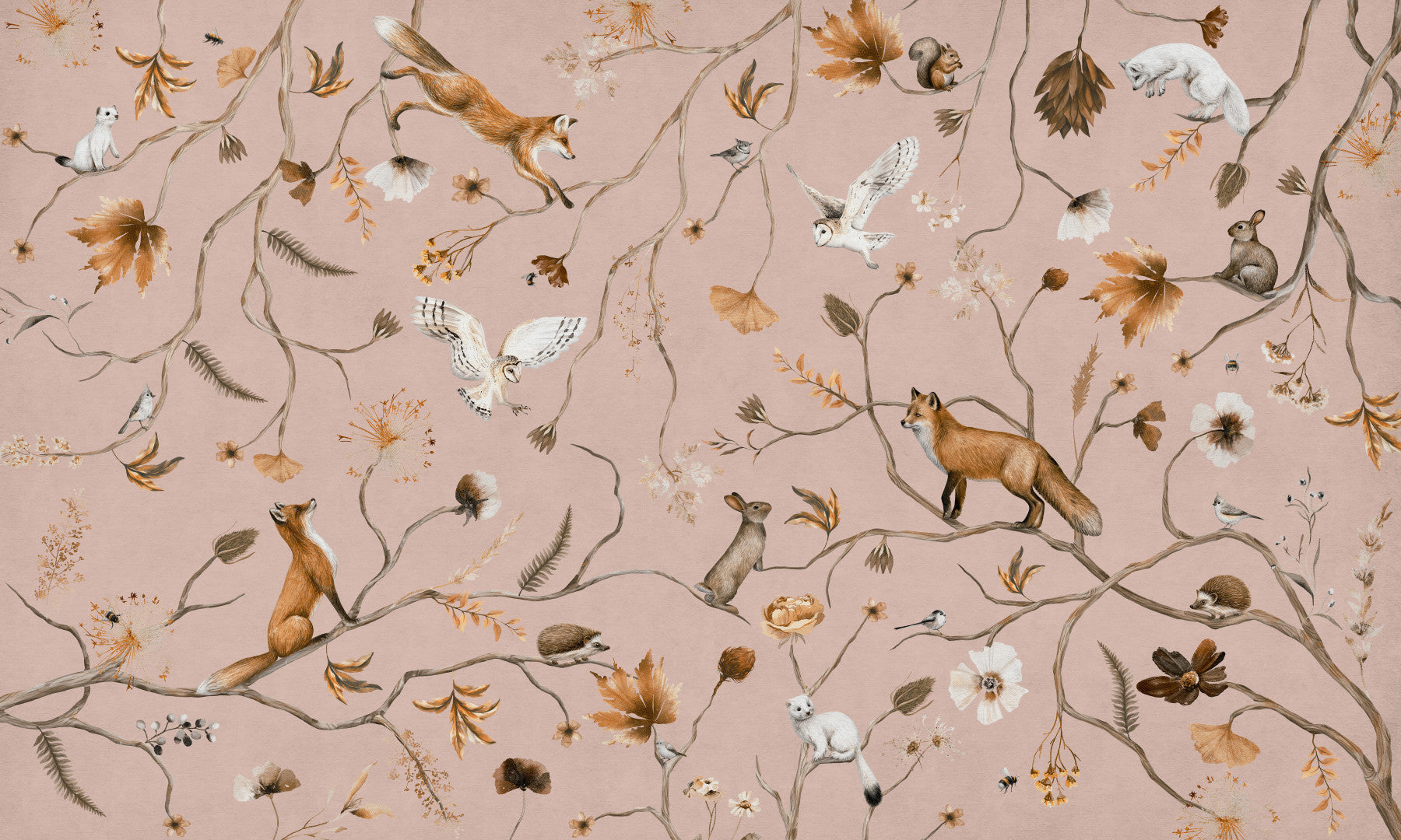 Bring a touch of the forest indoors with this artful animal scene. The design showcases foxes, owls, hedgehogs, and squirrels amongst detailed botanical drawings. The warm, blush-toned backdrop allows the naturalistic illustrations to pop. Consider this wallpaper for walls in children's bedrooms, hallways, or a study for a natural touch. Its muted tones and detailed design complement interiors with classic or vintage styles. Embrace a calming retreat in your own home.