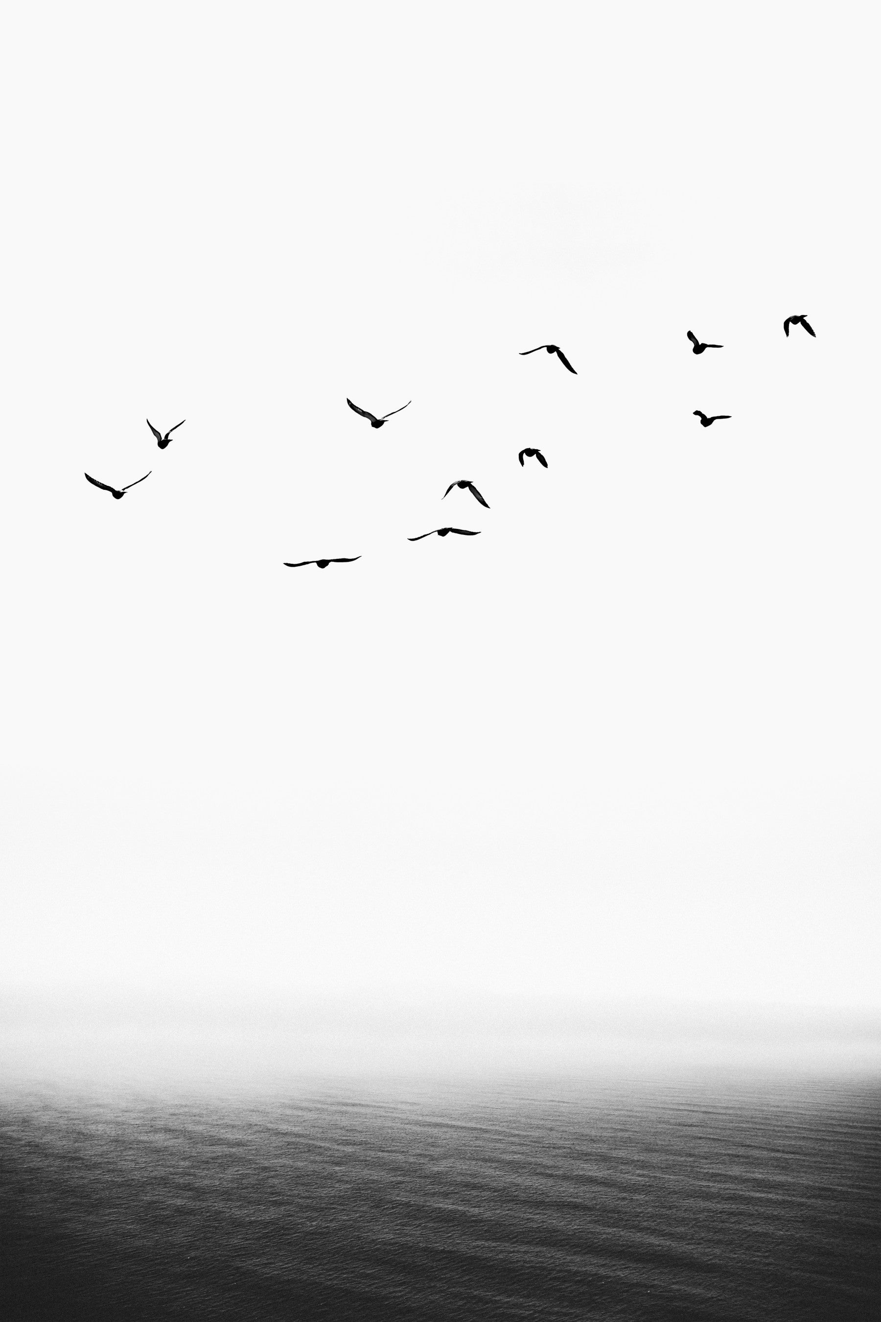Soar into boundless horizons with Forever Free a minimalist masterpiece capturing the essence of liberation. A flock of birds, silhouetted against a stark white sky, cuts a striking figure above the infinite expanse of the ocean. The monochrome palette evokes a sense of serenity and timelessness, emphasizing the raw beauty of nature and the unyielding spirit of freedom. Let this wallpaper grace your screen, serving as a daily reminder to break free from limitations and chase your dreams with unwavering determination. Embrace the boundless potential that lies ahead, just like the birds taking flight into the vast unknown. Feel the exhilarating rush of the wind beneath your wings and let your imagination take flight with this awe-inspiring visual narrative.