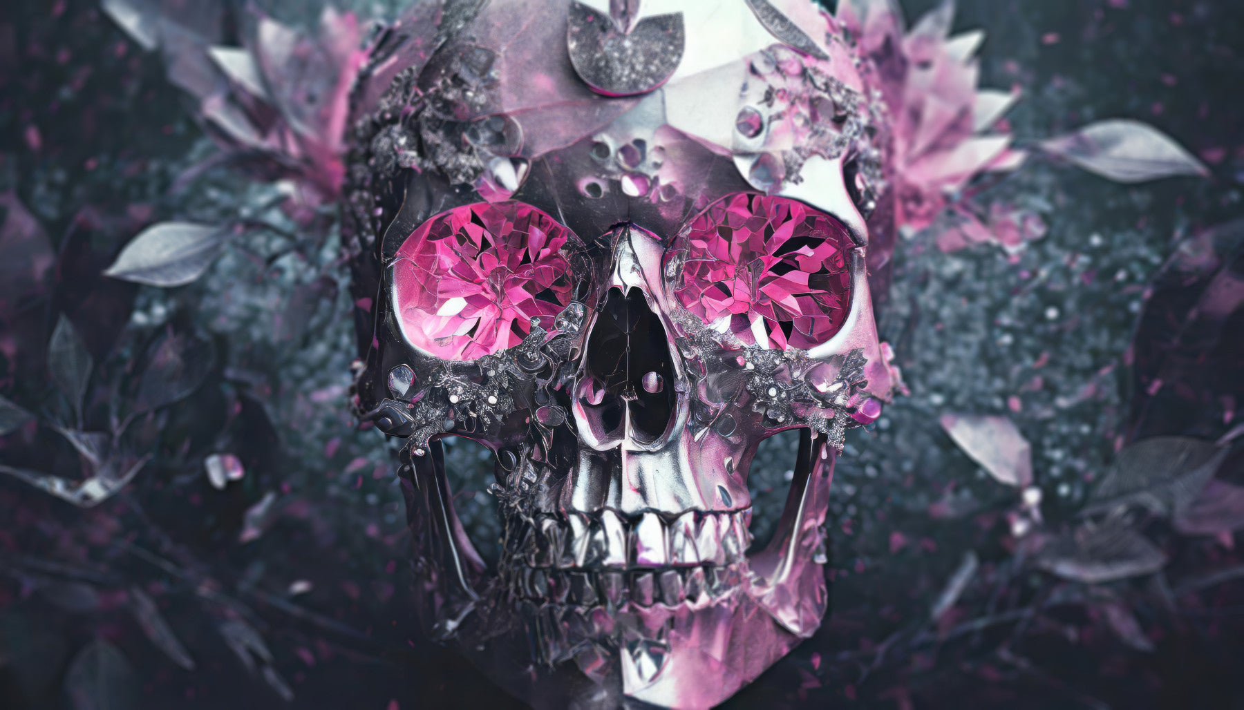 Transform your living space with this captivating wallpaper for walls. Metallic finish, the skull features ruby eyes and sits among delicate pink and purple flowers. The overall effect is intriguing and unique. Perfect for adding a touch of edgy elegance to a living room or bedroom, or bringing a bold statement to a home office. The design blends beauty with the unexpected and complements modern interiors.