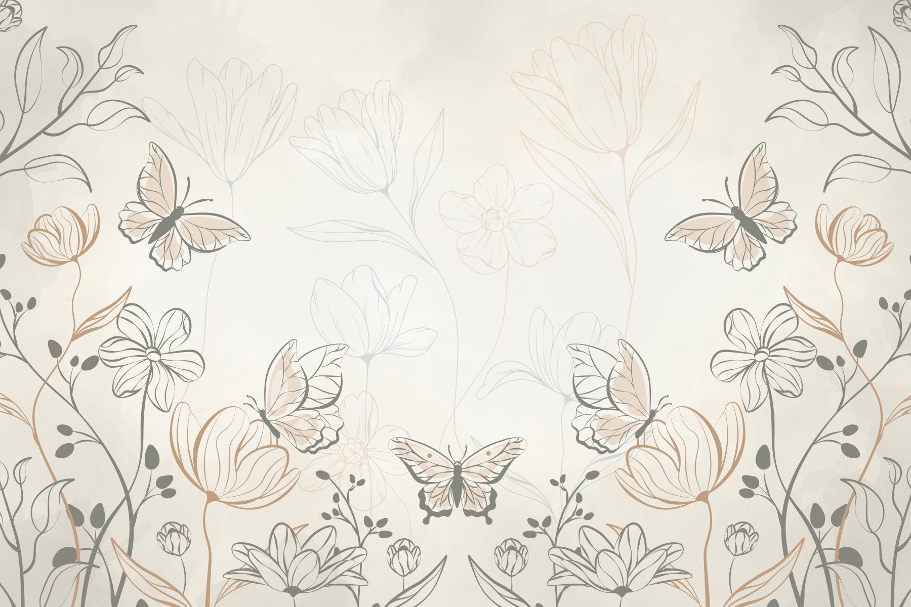 Bring a calm and natural beauty to your home with this gentle floral design. The wallpaper for walls features delicate butterflies and sketched flowers. Soft beige and grey colors offer a light, airy feel. This design complements bedroom, living room, or nursery interiors with a touch of simple grace. The artwork promotes a restful and attractive atmosphere that is easy to live with. It is equally suitable for a small accent wall or a larger space.