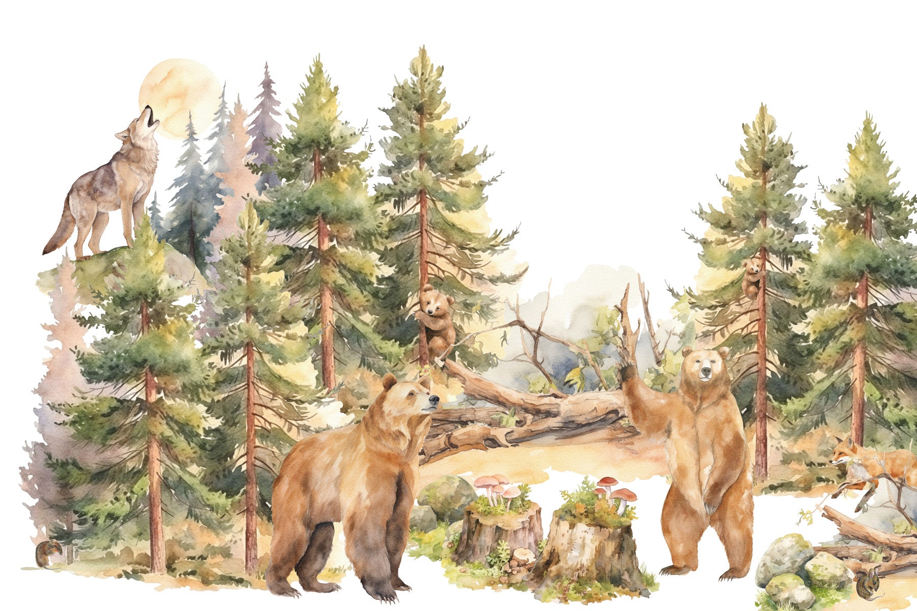 Invite a tranquil woodland scene into your home with this artful wallpaper by Uta Naumann. A watercolor wolf howls to the moon, while friendly bears and a playful fox roam among towering pine trees. This wallpaper for walls features a calming color palette of greens, browns, and soft yellows that create a relaxed, nature-inspired aesthetic. Ideal for a nursery, children’s room, or study, it will infuse any interior with a sense of peace and wonder.