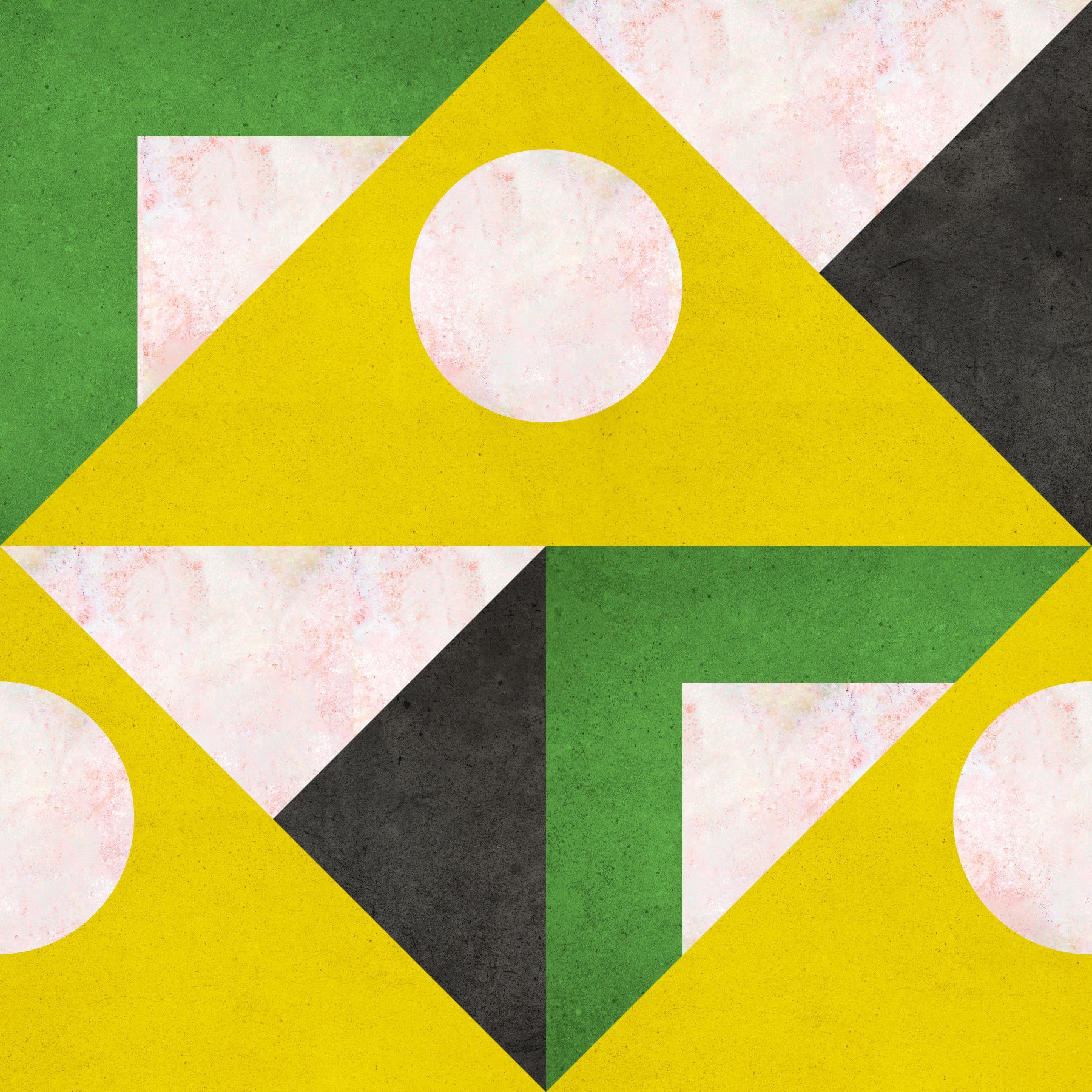 This wallpaper exudes a sense of calm and sophisticated modernism. The design features a seamless pattern of intersecting geometric shapes – triangles, squares, and circles – in a vibrant yet balanced palette of yellow, green, black, and a soft off-white. The textured backgrounds within each shape add depth and visual interest, creating a subtle interplay of color and form that is both calming and energizing. The repetition of the pattern provides a sense of order and rhythm, making it suitable for a variety of spaces from living rooms to bedrooms, adding a touch of contemporary elegance to any room.