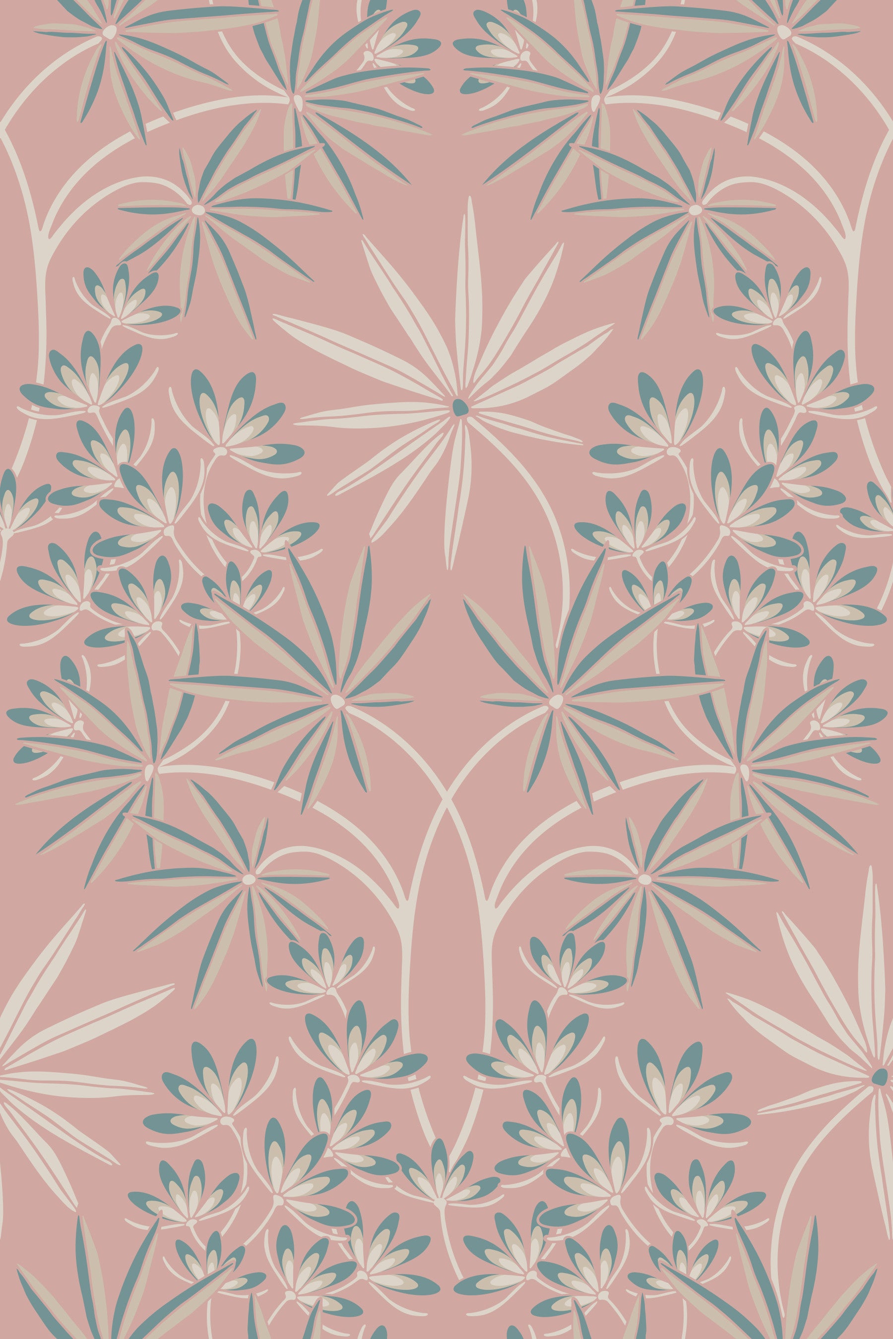 Immerse yourself in the gorgeous world of this Glamour floral damask wallpaper in a cottagecore Sage Green on Cream colourway. This floral tropical botanical pattern is an unapologetic celebration of Maximalism, referencing both Art Nouveau and opulent Jazz Age style, featuring cream, light teal and beige on flowers and tropical leaves on a dusky pink background in a delicate lacy damask layout. The symmetrical arrangement creates a sense of formal elegance, typical of damask patterns, with an exaggerated scale and gentle cottage color palette that is perfect for adding a touch of fresh energy to any space. This pattern design is also available in Other Colourways too! Original wallpaper pattern design by Jackie Tahara of UnBlink Studio.