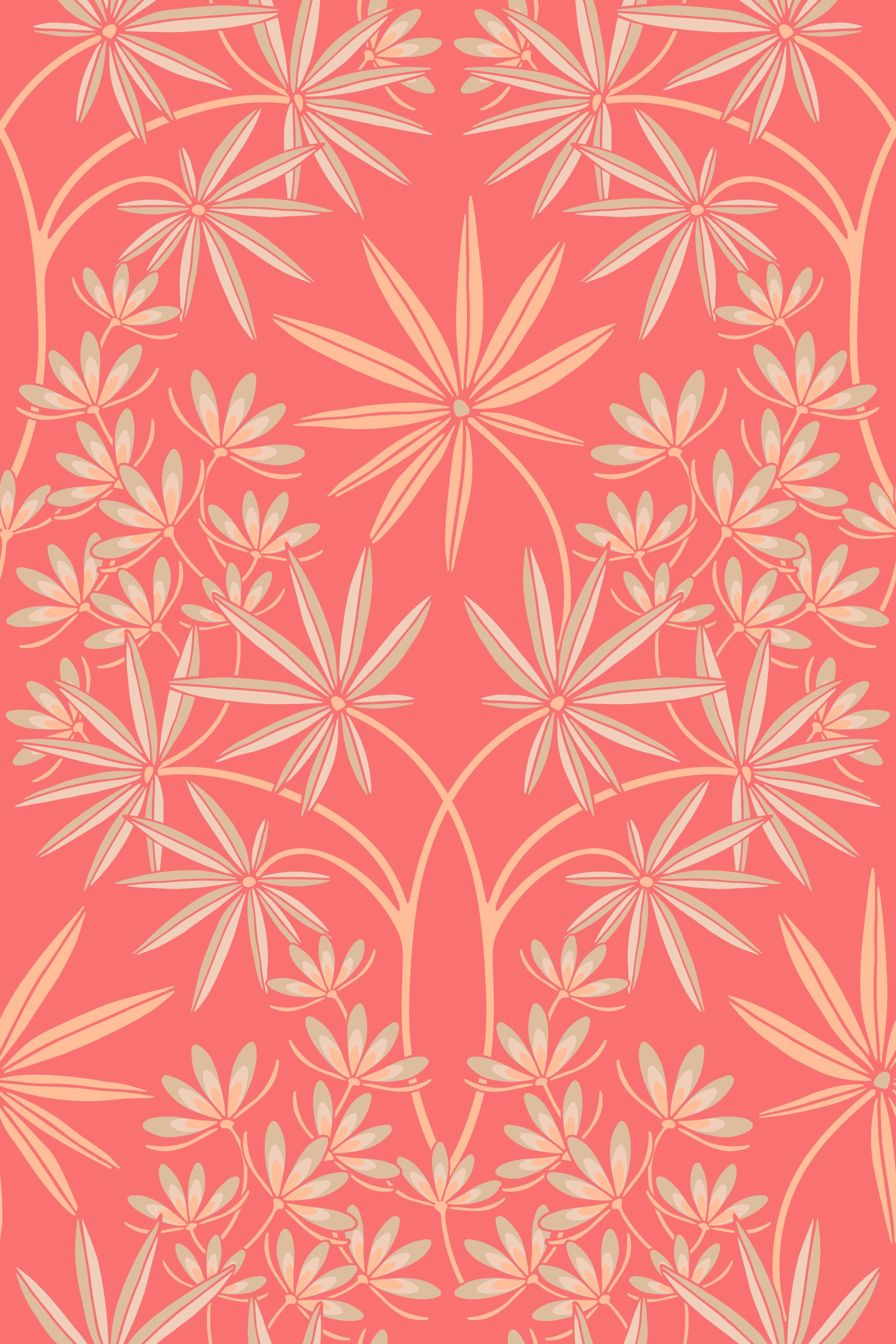 Immerse yourself in the gorgeous opulent world of this Glamour floral damask wallpaper in a Peach Fuzz Orange and Coral colourway reminiscent of Old Hollywood. This floral tropical botanical pattern is an unapologetic celebration of Maximalism, referencing both Art Nouveau and opulent Jazz Age style, featuring peach fuzz orange, cream and beige flowers and tropical leaves on a coral orange background in a delicate lacy damask layout. The symmetrical arrangement creates a sense of formal elegance, typical of damask patterns, with an exaggerated scale and warm color palette that is perfect for adding a touch of fresh energy to any space. This pattern design is also available in Other Colourways too! Original wallpaper pattern design by Jackie Tahara of UnBlink Studio.
