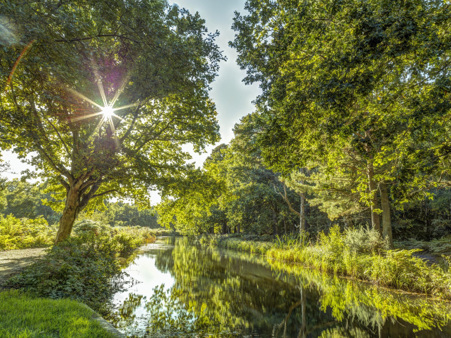 Basingstoke canal in countryside, UK. Transform your space with this radiant forest-canal scene. The image presents a waterway enveloped by vivid green trees. Sunlight streaks through the canopy, creating a beautiful interplay of light and shadow. Use this wallpaper for walls to establish a calming atmosphere in your living room, bedroom, or entryway. Its earthy tones and organic design adapt to a range of interior styles, from bohemian to modern. The bright sunlight offers a peaceful, refreshing aesthetic.