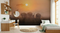Enliven your space with this evocative wallpaper for walls. It captures a serene sunrise scene featuring a herd of elephants bathed in golden light. Hues of amber and beige create a calming atmosphere. It's a marvelous addition to a living room, bedroom, or office. The gentle color palette and tranquil subject matter create a sophisticated backdrop that complements a variety of decor styles, from minimalist to traditional.