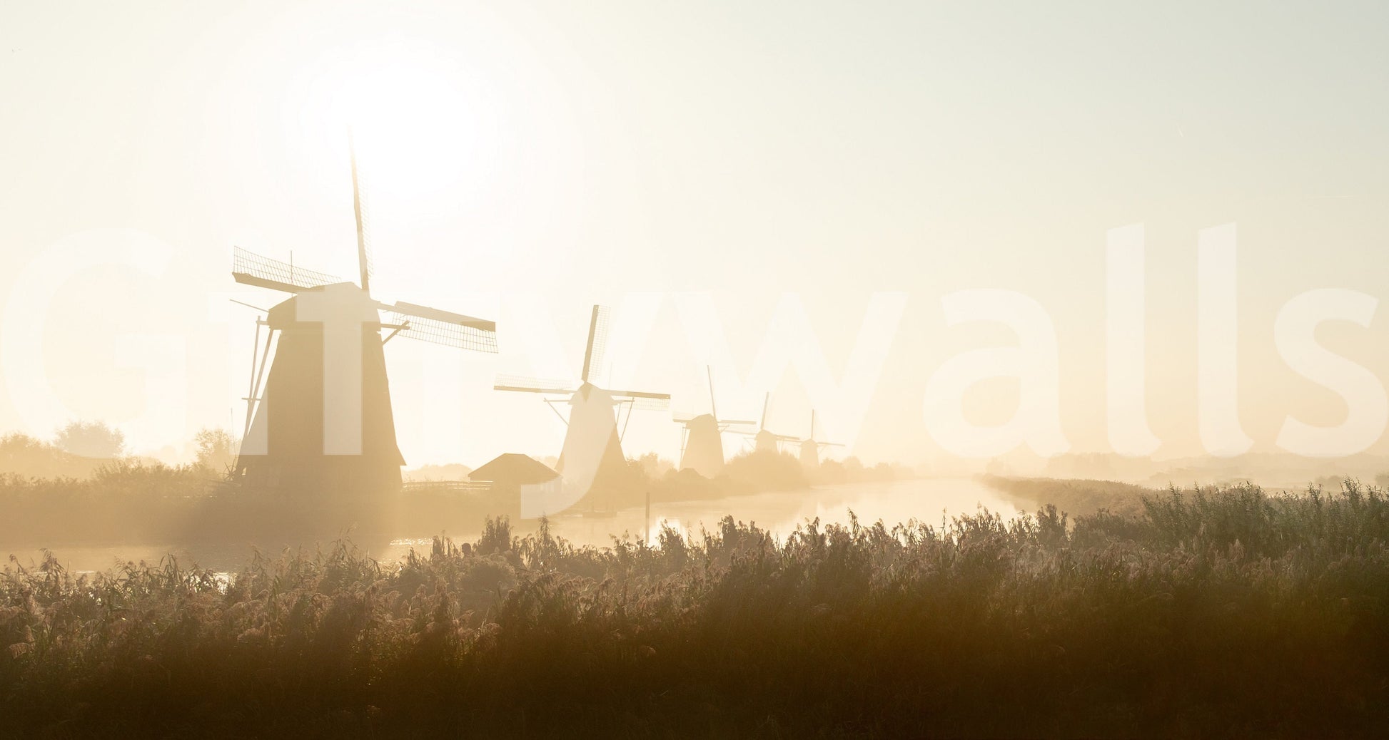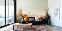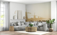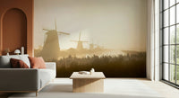 Invite tranquil scenery inside with this wallpaper for walls. It features iconic Dutch windmills silhouetted against a glowing, hazy sunrise. The warm gold and beige tones create a calming effect, perfect for a bedroom or living room. Imagine this peaceful scene transforming your space into a serene retreat. This design evokes a sense of quiet beauty and complements minimalist or rustic interiors, adding a touch of timeless charm.