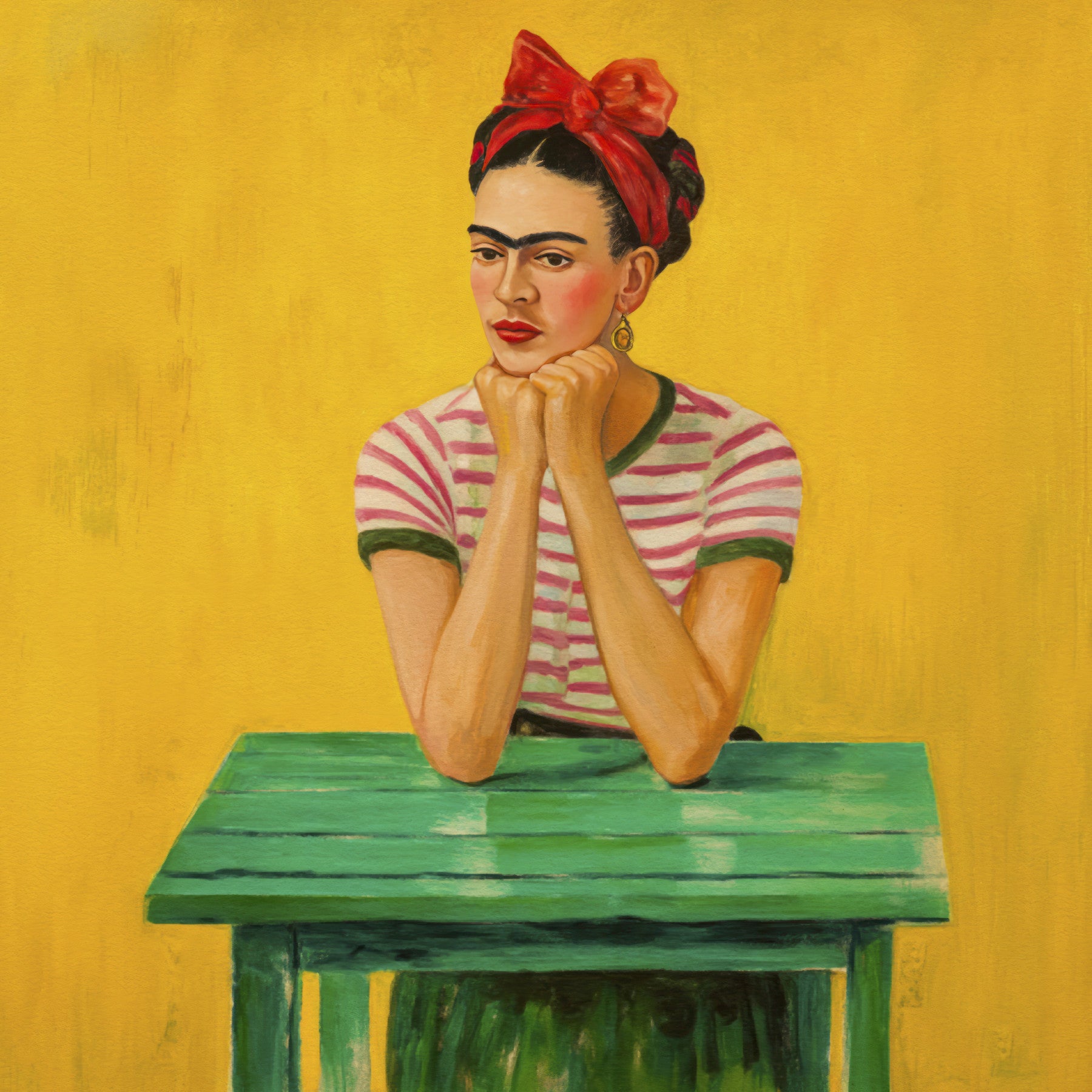 Immerse your space in a blend of art and introspection with this captivating portrait. The wallpaper features a striking woman in a striped shirt and vibrant red hair bow. Her pensive expression, captured with artistic brushstrokes, makes this image a stunning addition. The yellow backdrop evokes feelings of warmth and serenity, while the teal table adds a pop of colour. Perfect for anyone who admires art and history, this wallpaper will infuse any room with a touch of elegance.