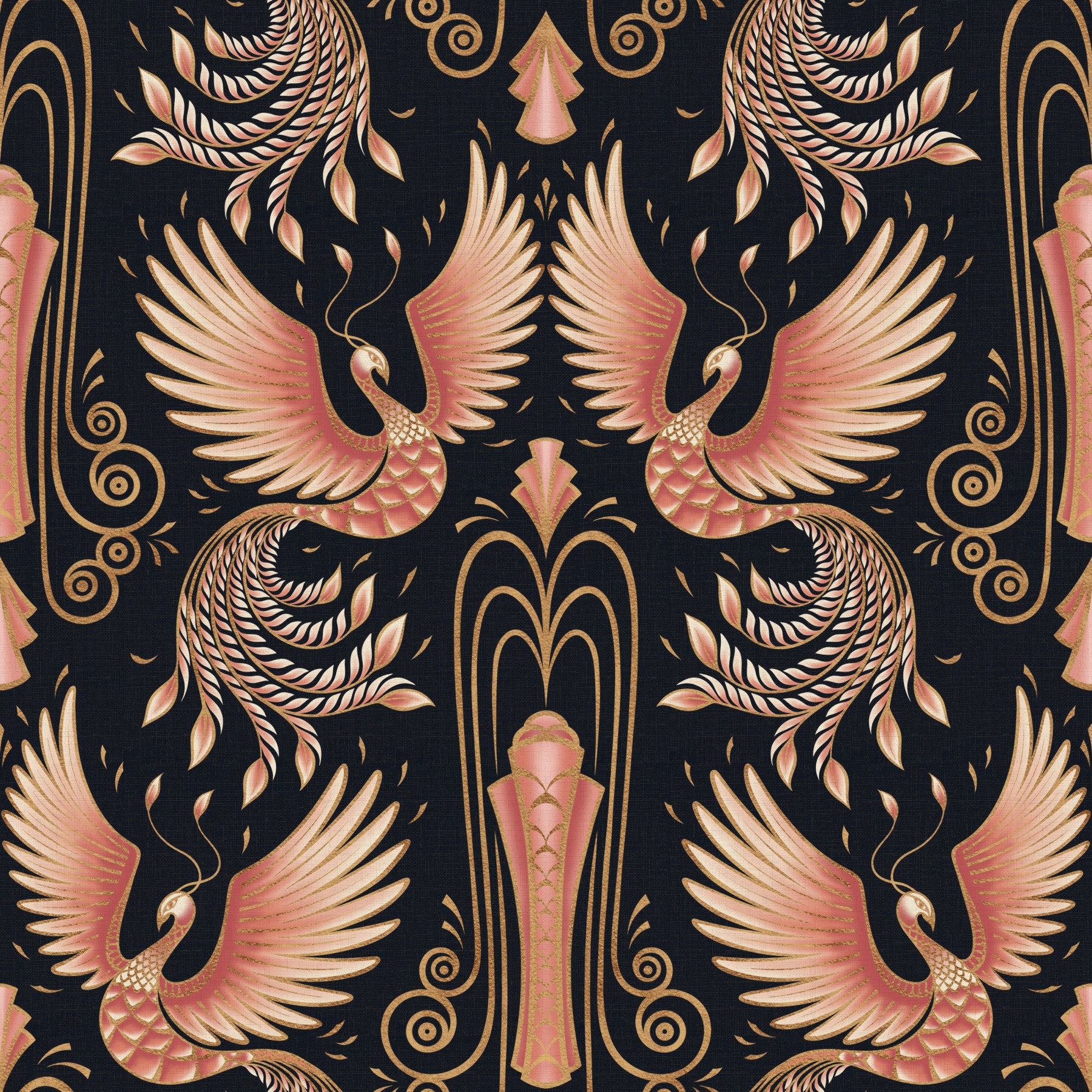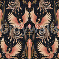Bathed in the warm glow of a golden hour, these magnificent phoenixes take flight. The wallpaper features a repeating pattern of stylized phoenixes, their plumage rendered in delicate shades of blush pink and cream, outlined with gleaming gold. The intricate detailing and subtle shading create a luxurious, almost ethereal feel. The dark background enhances the luminosity of the phoenixes and adds depth to the design, making it ideal for adding a touch of magic and tranquility to any space. The rich textures and detailed artistry will elevate any room's décor.