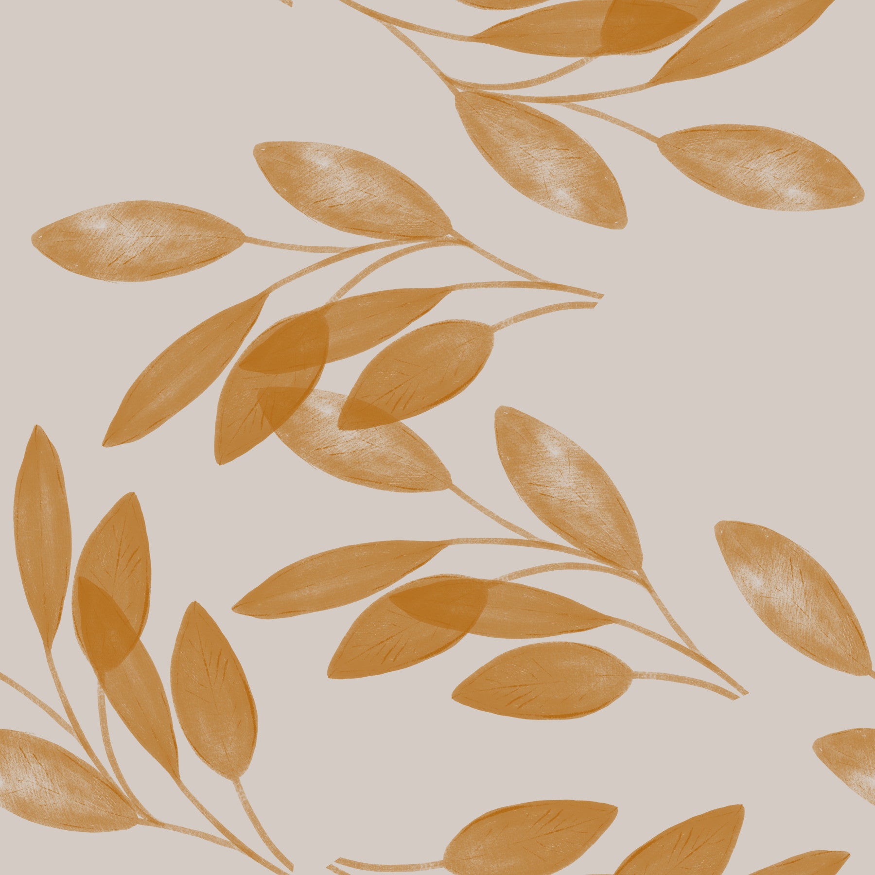 A minimalist leaf wallpaper with warm golden tones forming a subtle organic pattern.