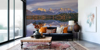Capture the beauty of dawn with this impressive landscape. The wallpaper presents a tranquil lake mirroring snow-dusted mountains under the warm glow of sunrise. Vivid hues paint the scene, offering a beautiful contrast between the cool water and the glowing peaks. Use this wallpaper for walls to transform any space into a peaceful retreat. Perfect for bedrooms, living areas, or even a home office, it infuses interiors with a sense of calm and natural wonder. The reflected design enhances both light and dark color palettes.