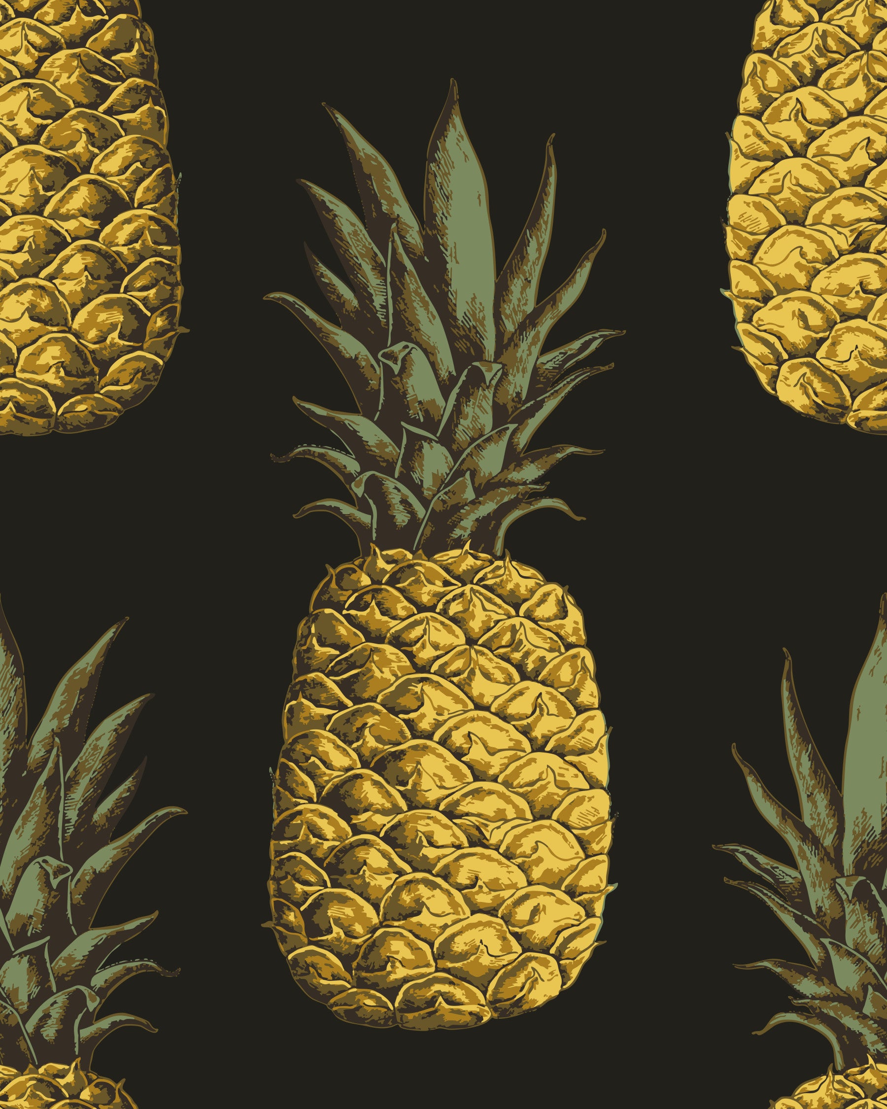 This wallpaper features a captivating pattern of golden pineapples set against a deep black backdrop. The pineapples are rendered in a detailed, hand-drawn style, with a blend of gold and olive green hues that create a luxurious and exotic feel. The intricate detailing of the pineapple's scales and leaves adds depth and texture to the design, making it visually rich and striking. The dark background enhances the vibrancy of the golden pineapples, creating a sophisticated and elegant aesthetic perfect for modern and tropical-inspired interiors. The seamless pattern ensures a cohesive and visually pleasing look across any surface.