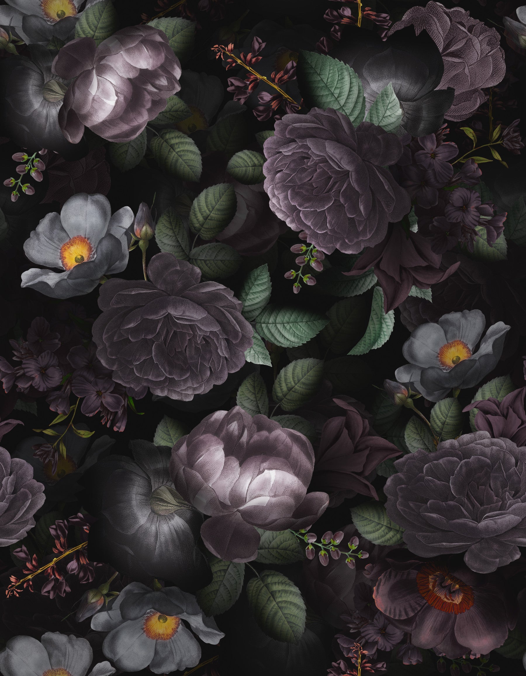 Indulge in the opulent darkness of 'Grandmillennial Dramatic Glamour Heritage Gothic Dark Moody Florals 8'. This wallpaper boasts a breathtaking tapestry of richly hued, velvety blooms. Deep purples and moody greys dominate the palette, creating a captivating contrast against the deep black backdrop. Intricate botanical details and a slightly gothic feel evoke a sense of vintage grandeur, capturing the essence of heritage aesthetics with a modern, dark romantic twist. The plush textures and dramatic shadows within the floral arrangement create a sense of depth and intrigue, perfectly capturing the spirit of grandmillennial style with a touch of dark, moody glamour. This wallpaper is perfect for those seeking a sophisticated, yet slightly unconventional, design statement.