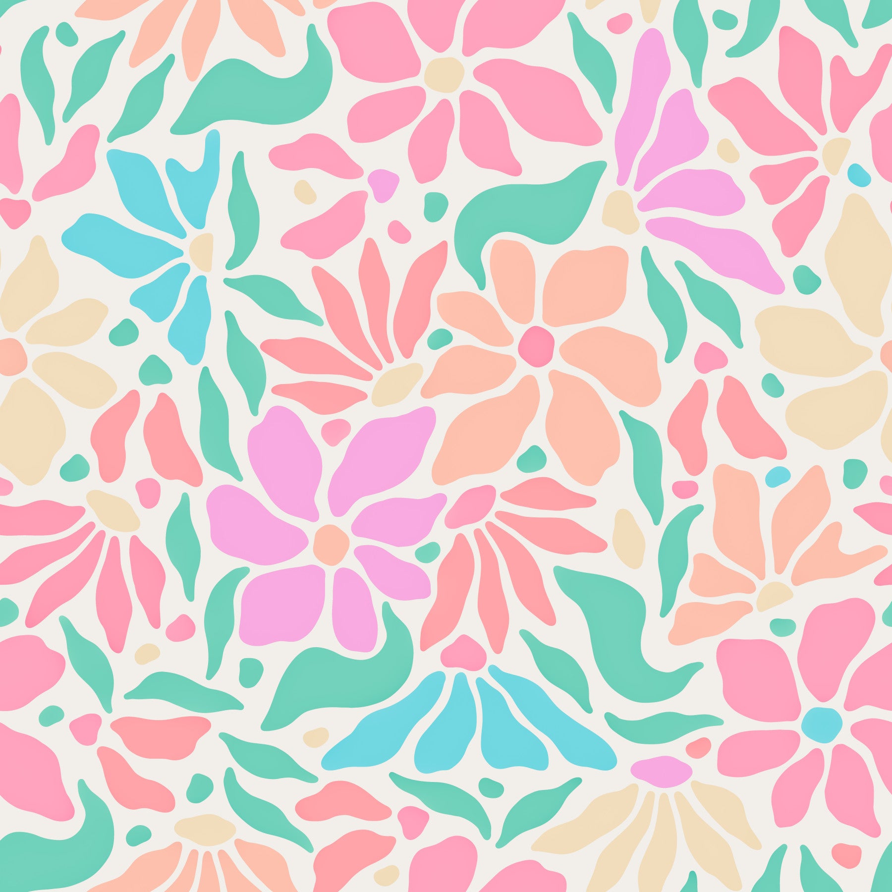 Dive into a vibrant world of 'Groovy Flowers,' a wallpaper design bursting with organic, free-flowing forms. Pastel pink, coral, mint green, and soft blue flower shapes dance across a creamy off-white background, creating a playful and uplifting mood. The stylized blossoms are reminiscent of 70s aesthetics, reflecting a retro-chic vibe. This seamless pattern offers a calming yet energetic backdrop, perfect for adding a touch of whimsical charm to any room.