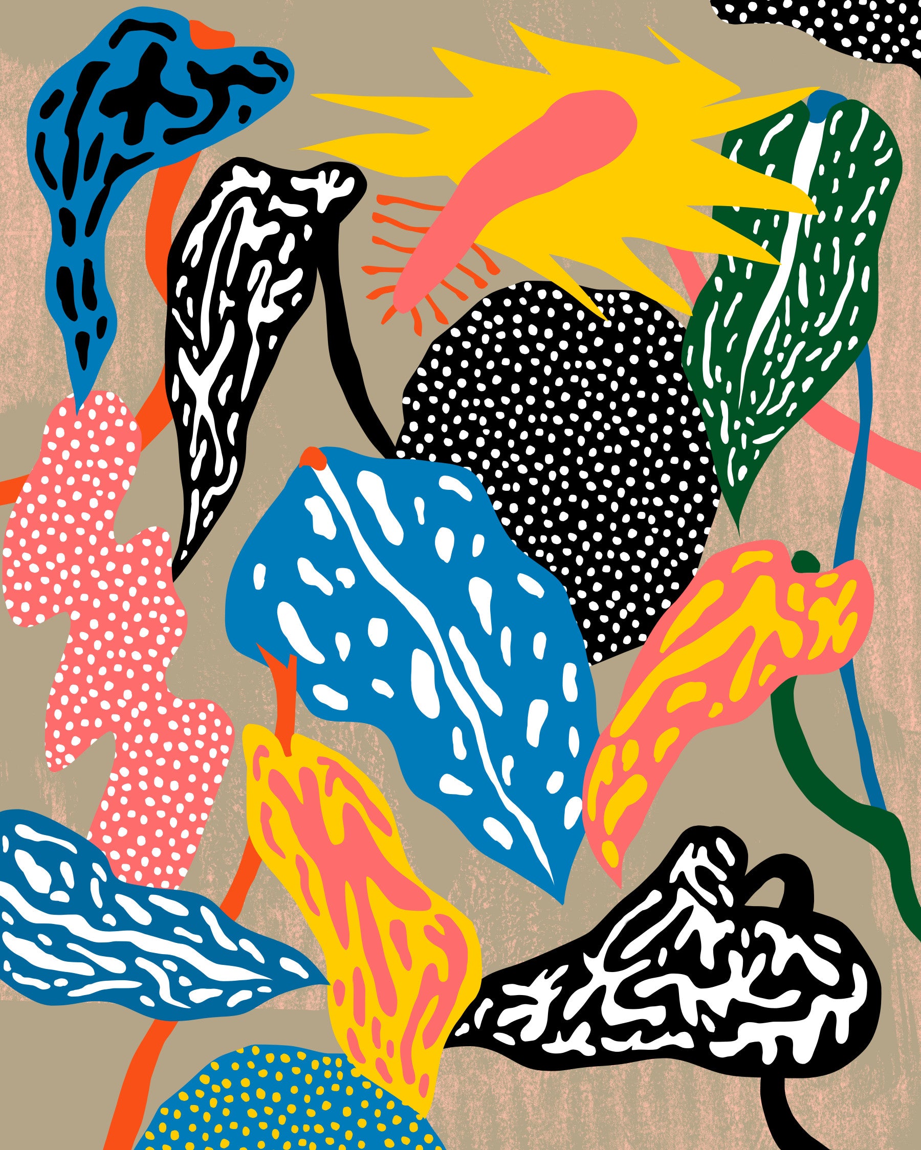 Transform your walls with this groovy jungle vibe! This energetic wallpaper showcases a vibrant mix of abstract shapes. Think bold colors like blue, yellow, pink, green, black and beige, perfect to create a focal point. The playful composition brings a fresh, modern touch. Envision this fun design invigorating a living room, adding character to a kid’s bedroom, or enlivening a hallway. Use wallpaper for walls to create an instant transformation with unique style. The pattern works wonderfully in modern interiors seeking a lively and cheerful design element.