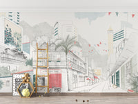 Give your space the charm of a hand-sketched cityscape wallpaper with this stunningly detailed urban sketch mural. Featuring a blend of vintage and modern architecture, this artistic urban landscape mural captures the essence of a lively city street with intricate buildings, lush palm trees, and festive bunting. Surrounded by the sketch-like city skyline, the image offers a sophisticated, clean aesthetic, a good fit for modern chic interiors. For a home, office, or café, this pastel cityscape mural takes your walls to the next level of stylishness. Elevate your décor with this architectural city mural, designed for timeless sophistication.