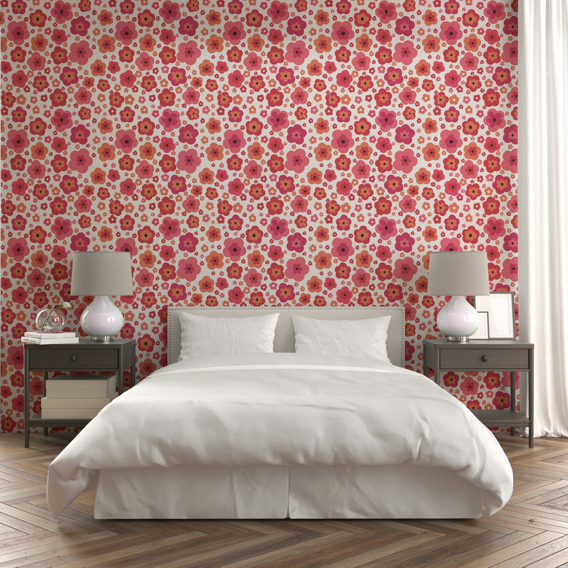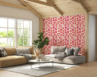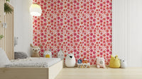 This wallpaper showcases a delightful retro-inspired floral pattern. A variety of pink and coral flowers in various sizes create a playful, yet sophisticated aesthetic. The hand-drawn style adds a touch of whimsical charm, making it perfect for adding a touch of vintage style to any room. The simple yet vibrant design makes it incredibly versatile, suitable for bedrooms, living rooms, or even kitchens. The bold colors and the carefree energy of the flowers produce a cheerful and optimistic mood.
