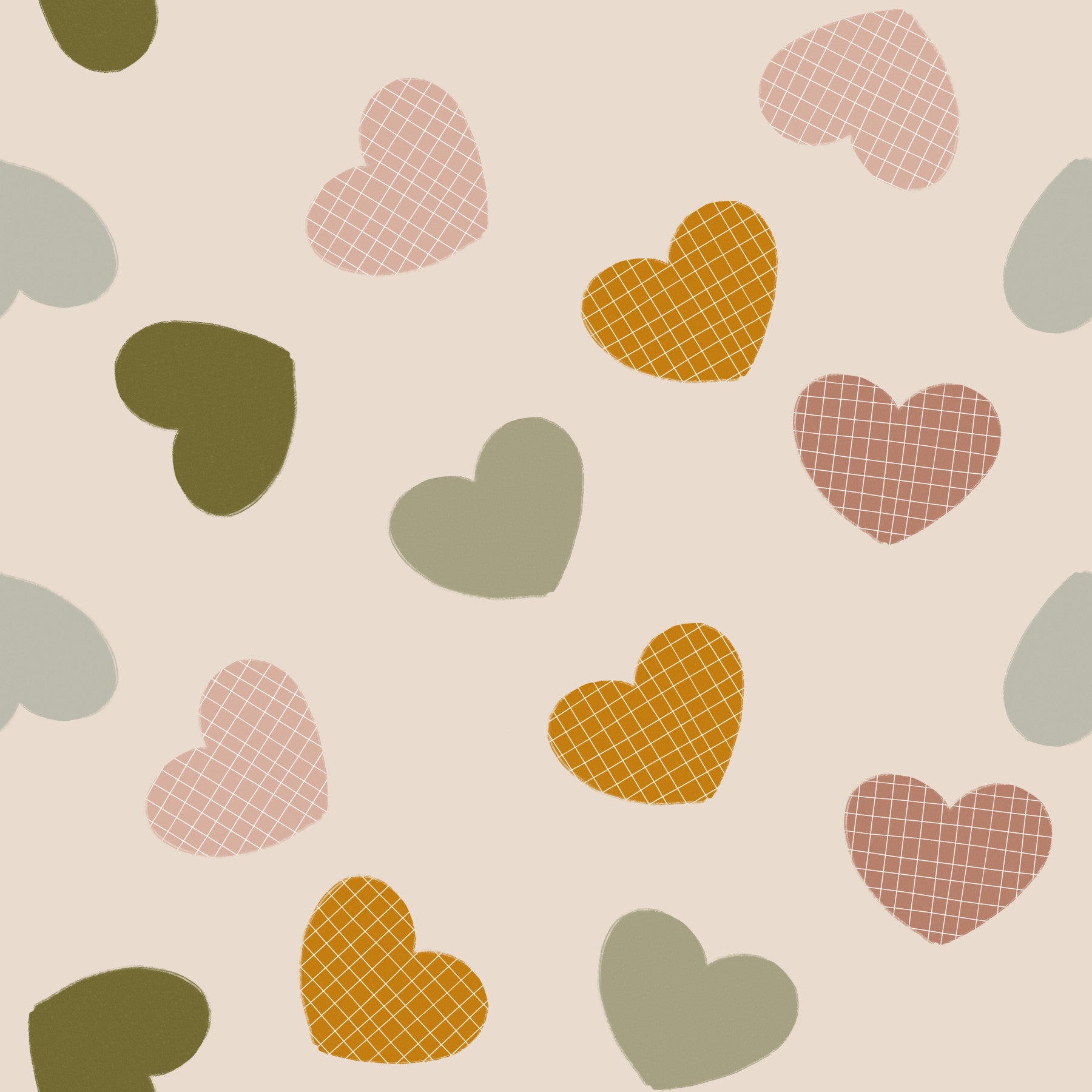 Playful heart shapes in mustard, olive, blush, and beige forming a sweet pattern on this wallpaper.