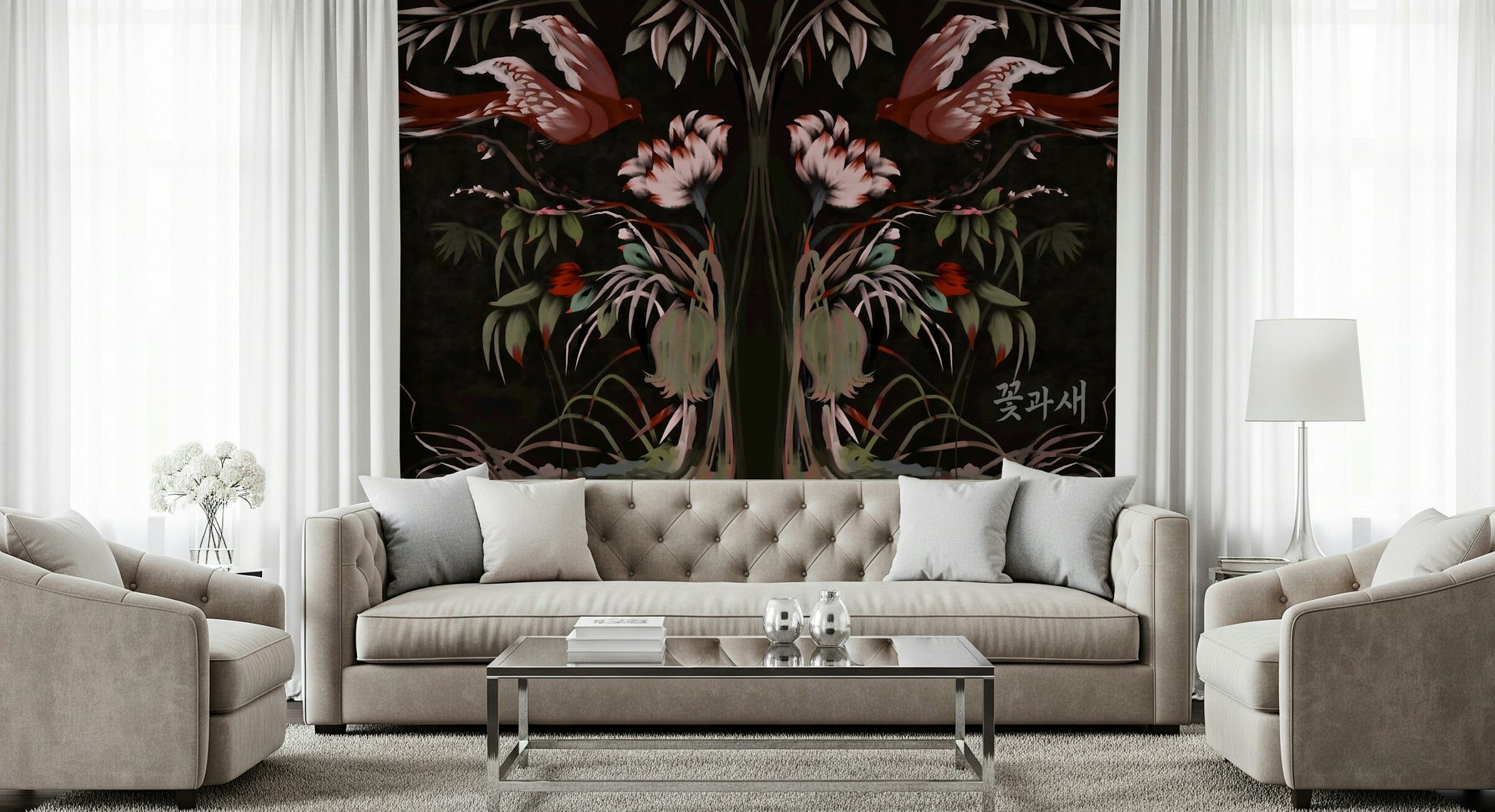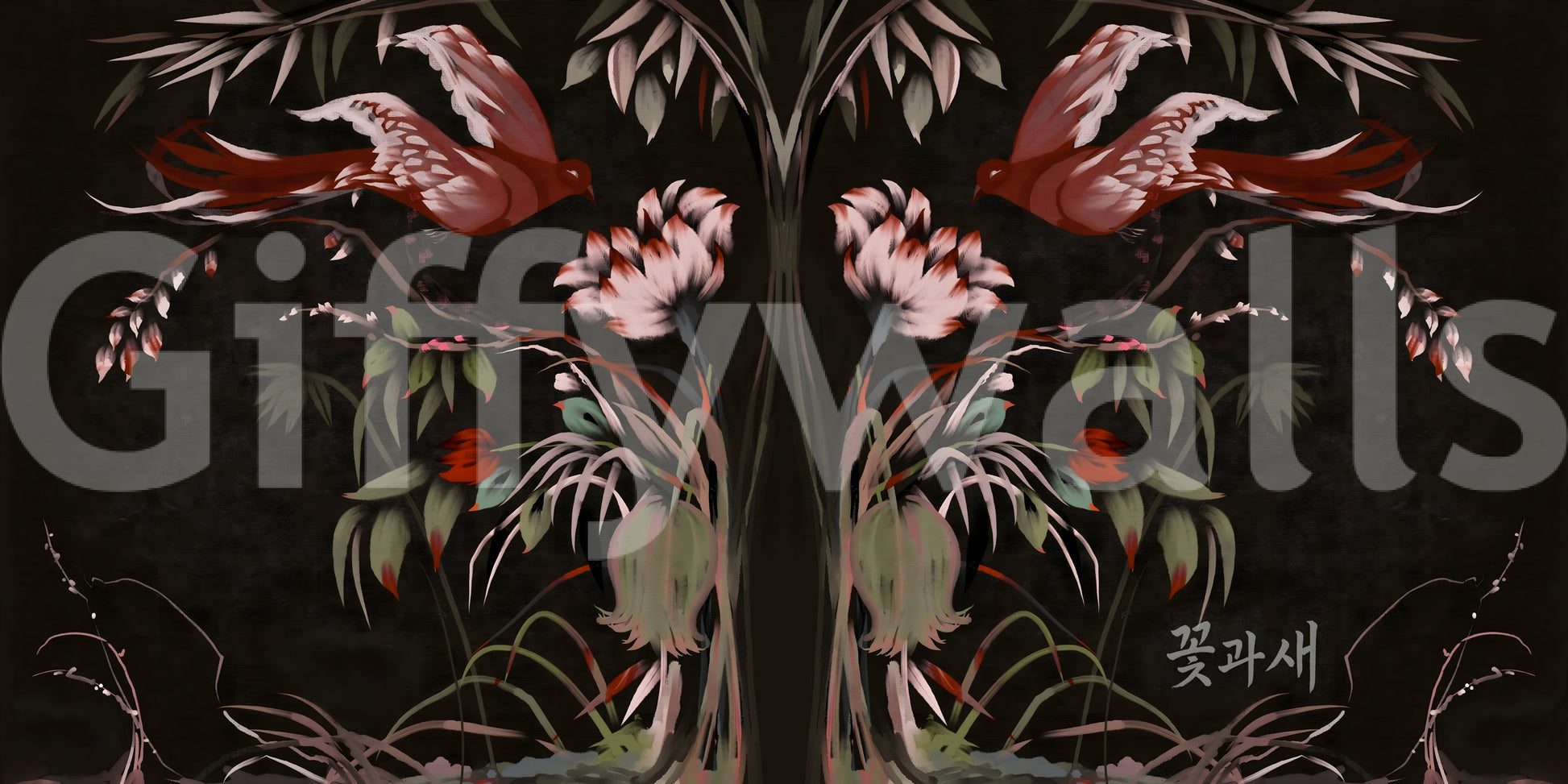 Evoke the serene beauty of Korea's Joseon dynasty with 'Heaven's Birds.' This wallpaper offers a modern interpretation of traditional Korean art, featuring elegant birds in flight amidst stylized flora. The rich, dark backdrop enhances the delicate details of the blossoms and the birds' meticulously rendered plumage. Inspired by 'Hwajodo' paintings, the symbolic harmony between nature and grace is captured. The mirrored design lends a sense of balance and tranquility, creating a focal point that draws the eye and adds sophistication to any space. Introduce a touch of historical artistry into your contemporary lifestyle with this design, perfectly embodying the timeless appeal of Korean aesthetics. Experience the calming presence of these celestial creatures, transforming your walls into a canvas of cultural richness and artistic expression. Perfect for those seeking a blend of tradition and modern elegance, 'Heaven's Birds' is more than just a wallpaper; it's a statement of refined taste.