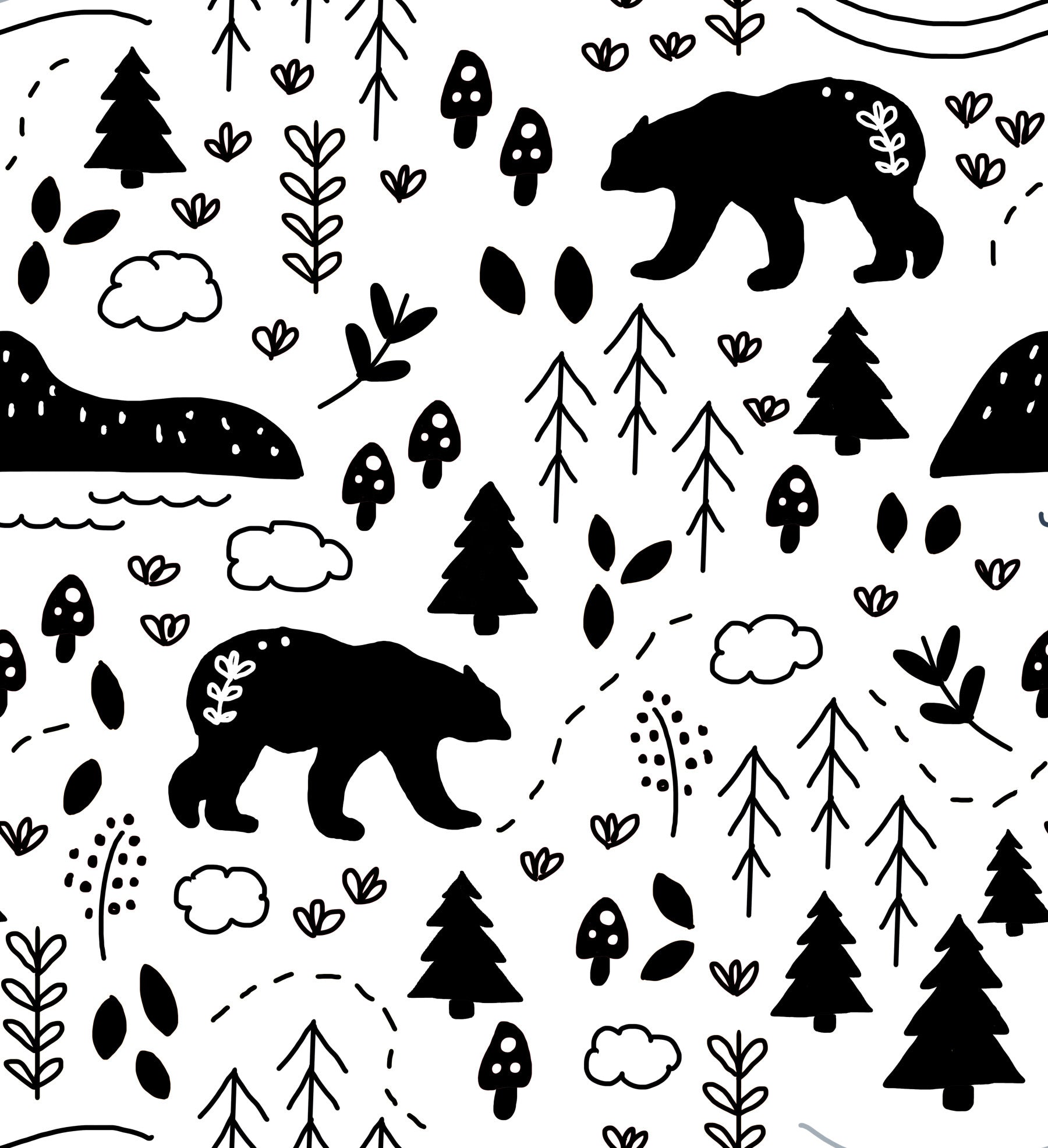 Embrace the serene beauty of 'Hiking Country' with this captivating wallpaper. Silhouetted bears traverse a whimsical landscape of stylized evergreens, whimsical flora, and charming mushrooms, all rendered in a striking monochrome palette. The minimalist design evokes a sense of peaceful adventure, perfect for those who appreciate the simple joys of nature and a touch of Scandinavian aesthetic. The repeating pattern creates a calming and cohesive backdrop for your digital devices, bringing a breath of fresh air to your screen.