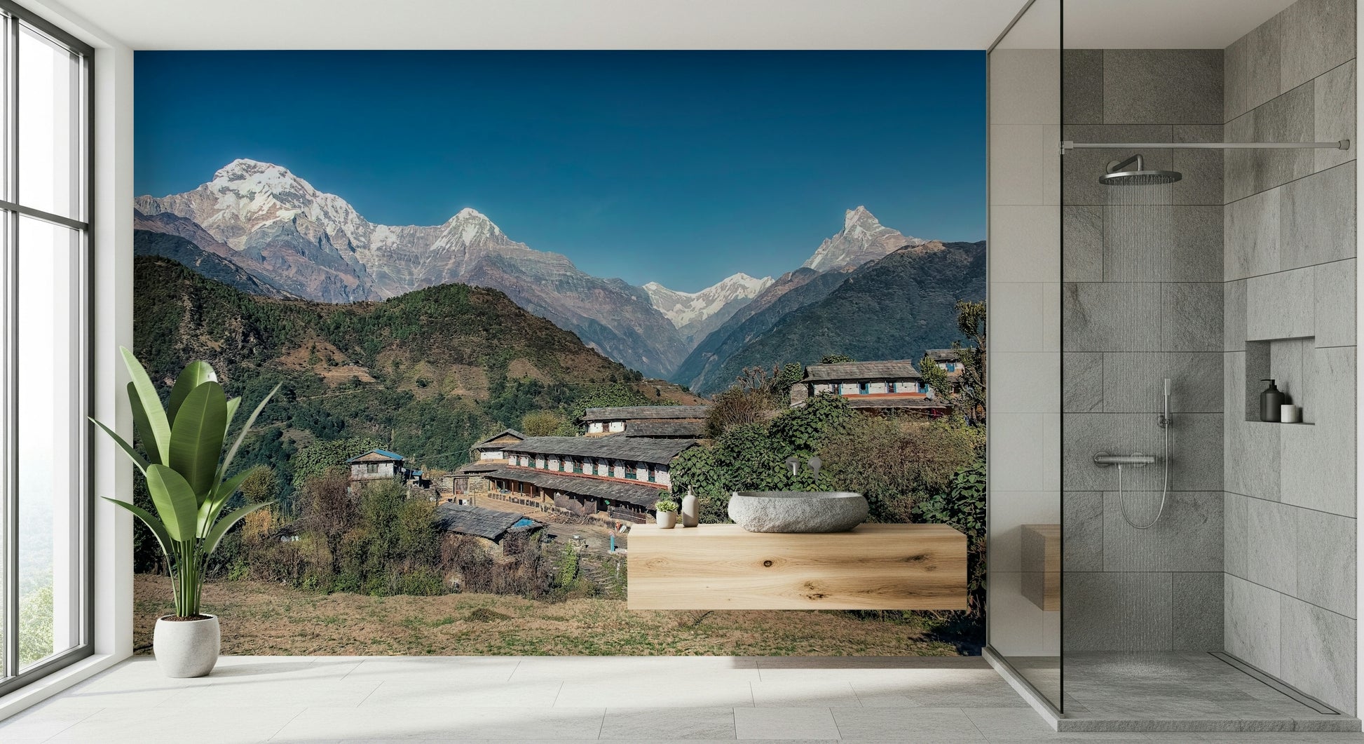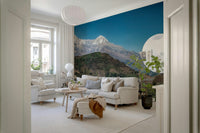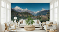 Bring the serene beauty of the Himalayas into your home. This landscape design features snow-capped mountains under a clear blue sky, perfectly framing a quaint village nestled in the foothills. Lush greenery softens the rugged terrain, creating a balanced and inviting vista. Ideal for a living room, bedroom, or office, this wallpaper for walls creates a calming atmosphere and adds depth to any room. The natural colors and detailed scenery complement interiors with a minimalist or nature-inspired theme, offering a refreshing escape from the everyday.