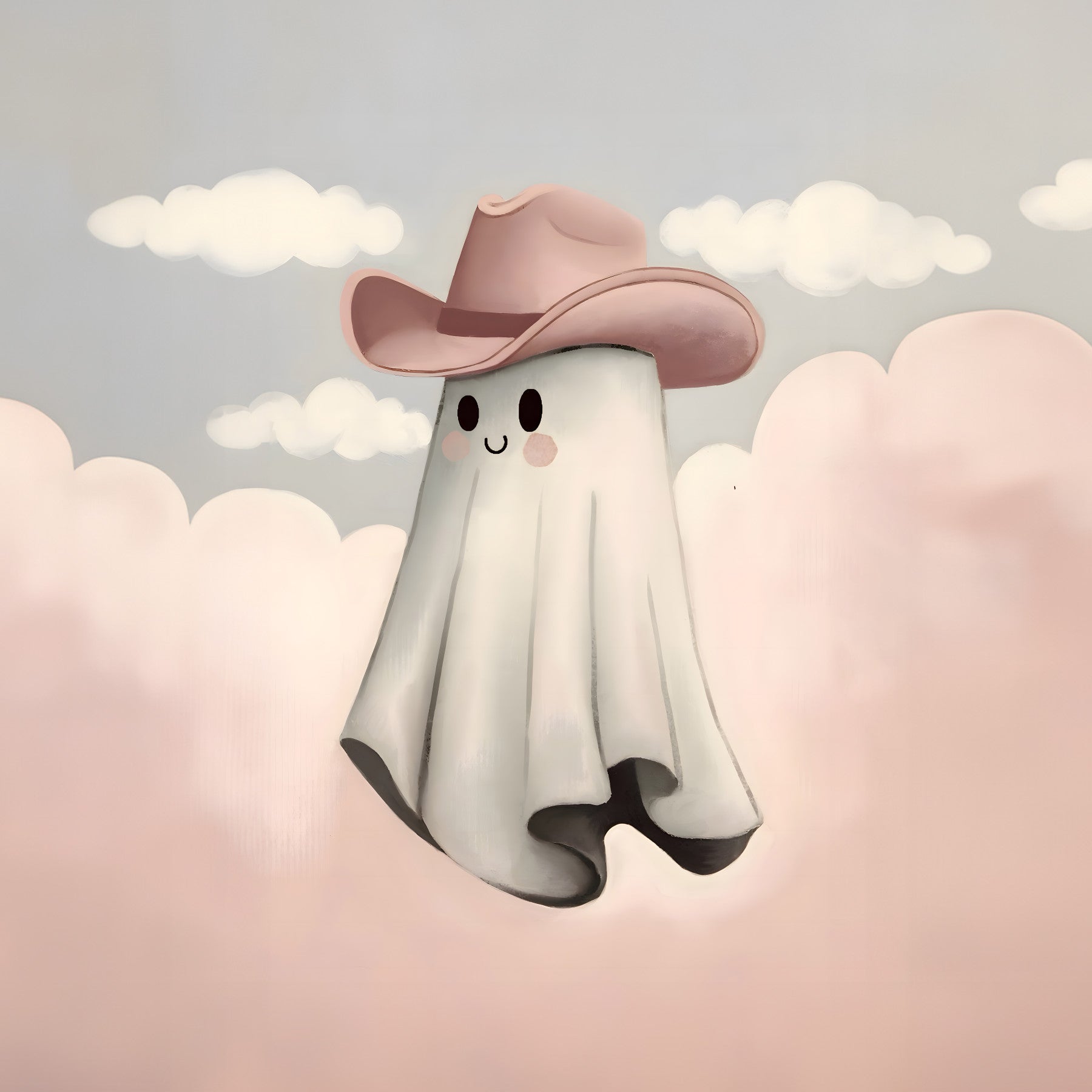 Saddle up for a ghostly good time with Howdy Ghost This adorable wallpaper features a friendly specter sporting a stylish pink cowboy hat, drifting through a dreamy landscape of soft, pastel clouds. With its sweet, minimalist design, this image brings a touch of whimsical charm and spooky fun to your screen. The gentle color palette, dominated by blush pink and muted grey, creates a calming and inviting atmosphere, perfect for adding a playful yet serene touch to your digital space. Give your device a little ghostly flair and a whole lot of Southern charm with this unique and delightful wallpaper. Yeehaw, and boo!