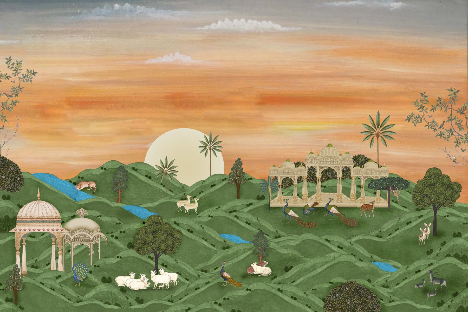 Transform your interior with this enchanting wallpaper for walls, capturing the serene beauty of a classic Indian landscape. Rolling emerald hills, traversed by tranquil blue rivers, form the backdrop for ornate, domed palaces. The warm orange and subtle gray sky, punctuated by a soft white sun, casts a golden hour glow over the scene. Peacocks display their plumage, deer graze peacefully, and other animals inhabit this idyllic setting. This artistic design, inspired by traditional Indian miniature paintings, infuses your living room, dining room, or bedroom with historical elegance and a calming, luxurious ambiance. It creates a captivating accent wall, celebrating rich cultural artistry.