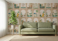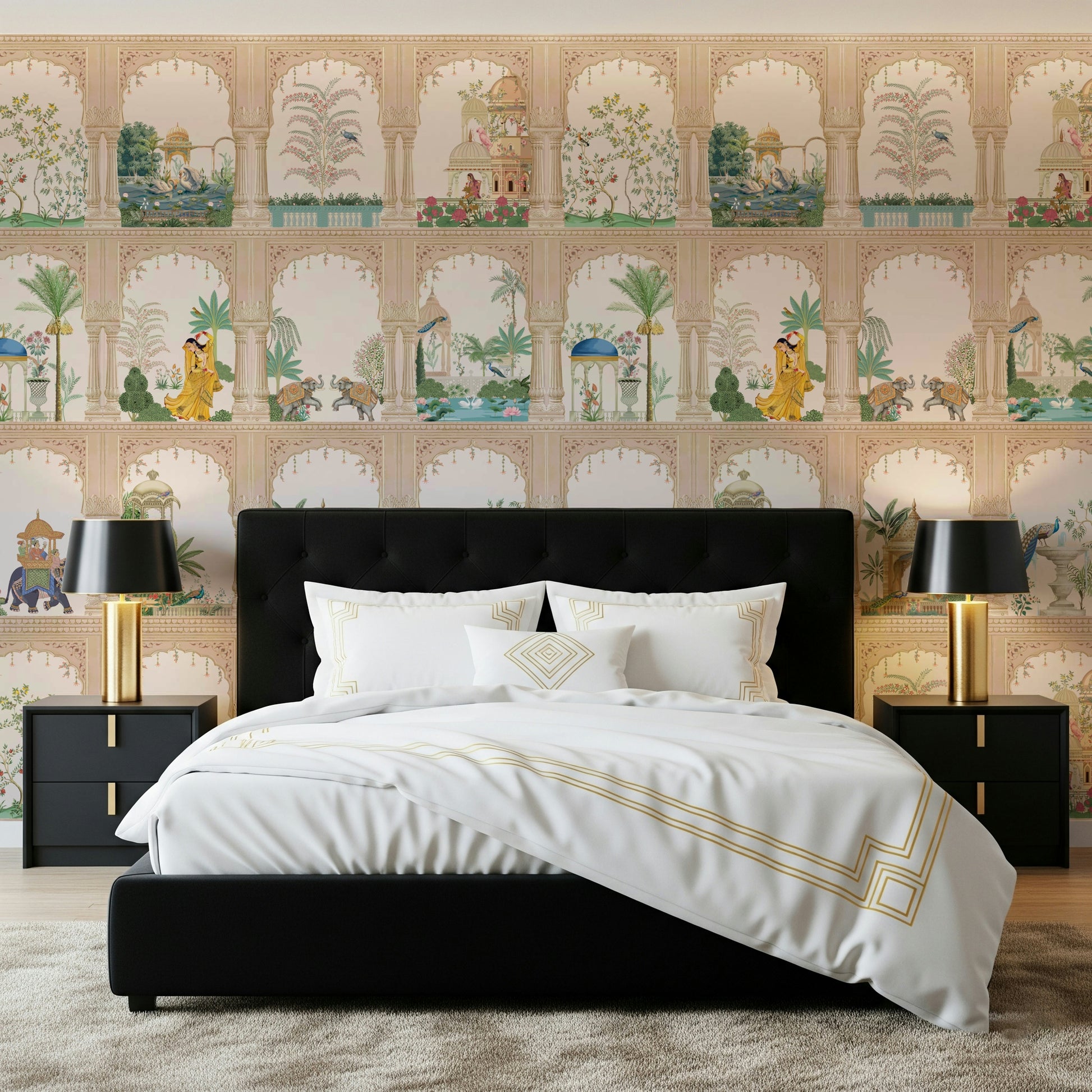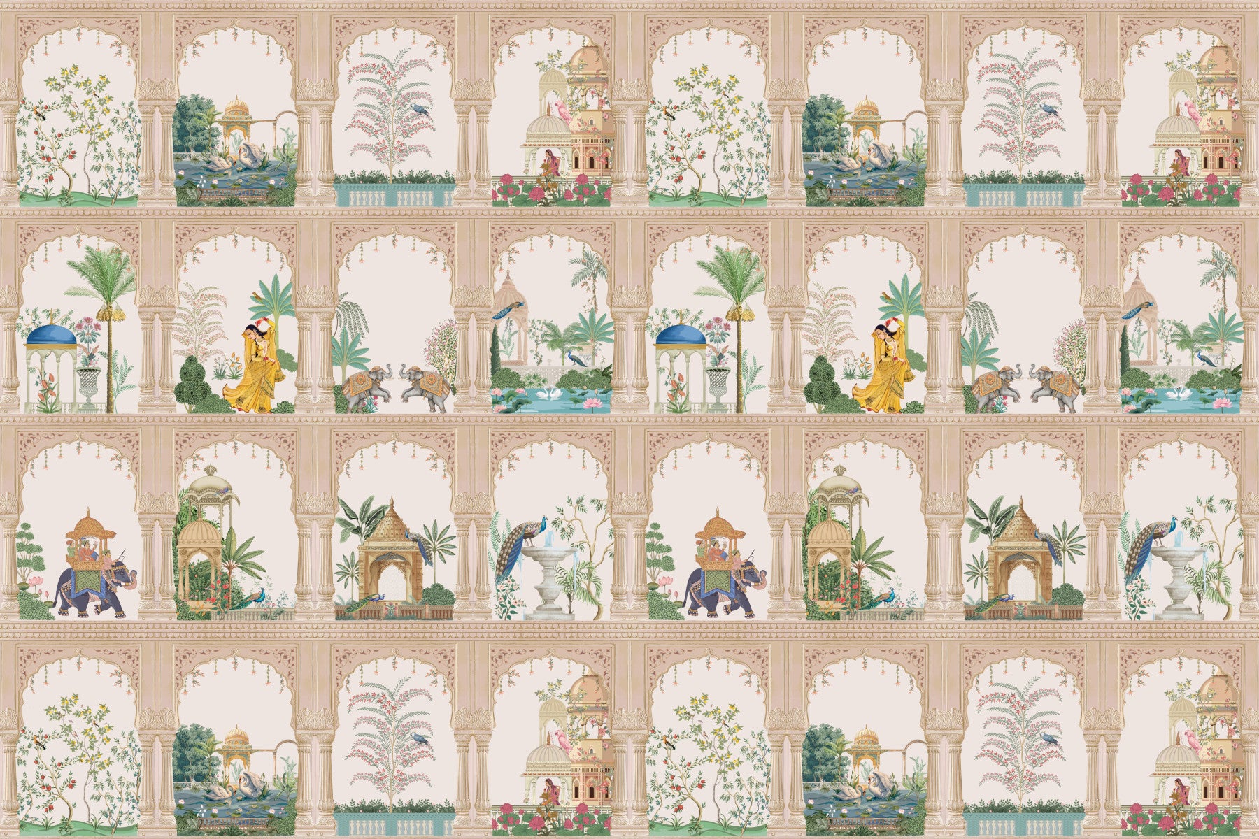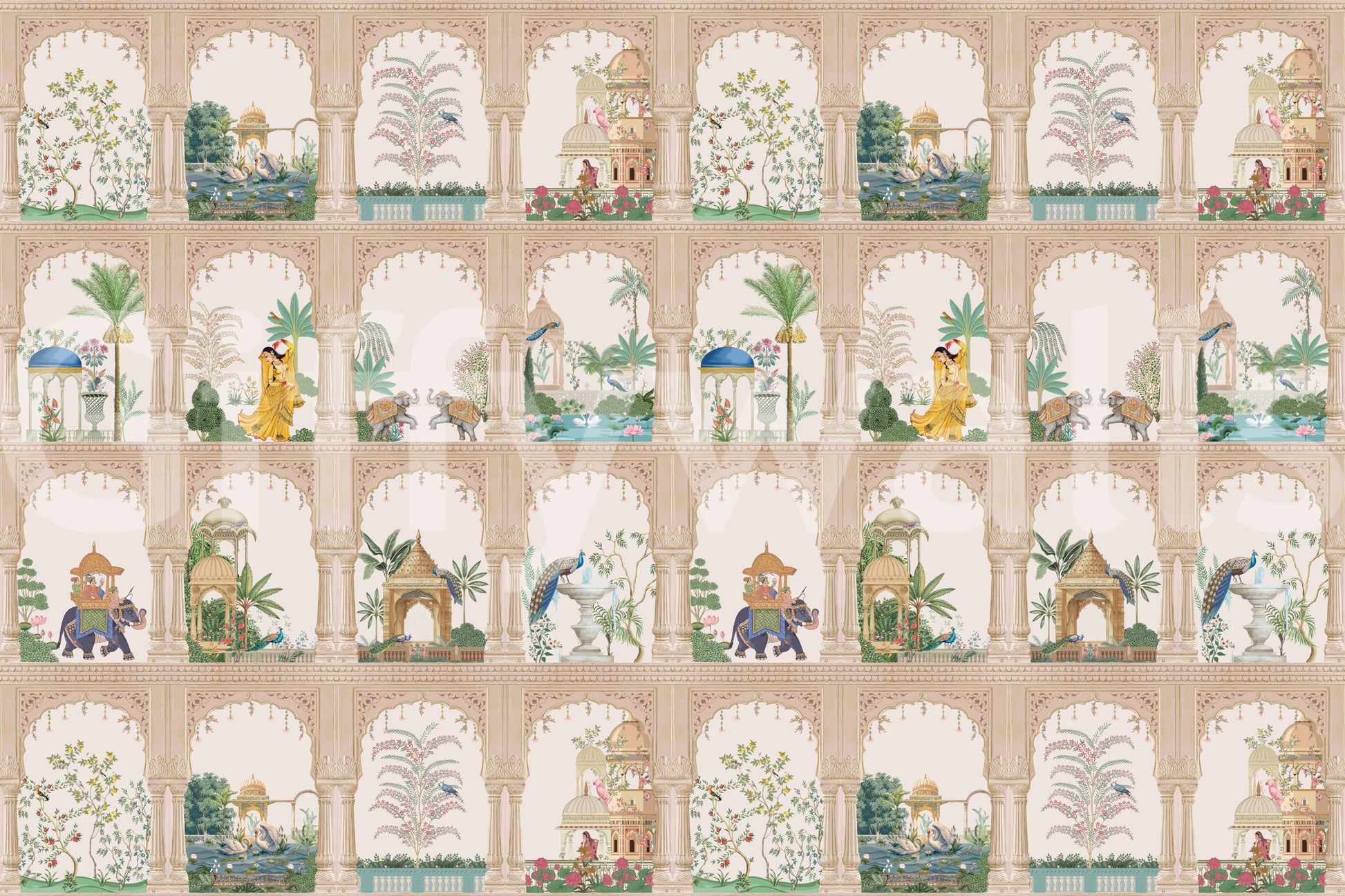 Elevate your interior with this stunning wallpaper for walls, showcasing a romanticized Indian palace view. Repeated arches reveal glimpses of lush gardens, elephants, and figures. The design uses a muted color palette with hints of yellow, green, and soft pink, making it suitable for various rooms. This wallpaper brings a serene and historic feel. Use it in a bedroom, living room, or dining room to evoke a sense of global elegance. The architectural details provide a sophisticated backdrop, enhancing any interior space.