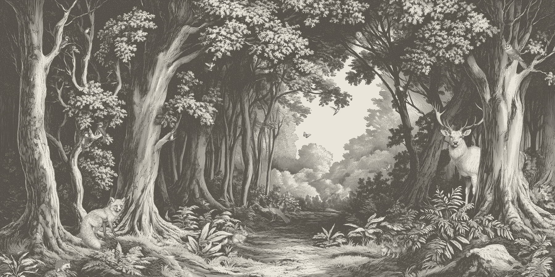 Enter a magical world filled with forest animals, birds and butterflies all illustrated in the style of a 19th century picture book. Like having the doorway to a fairy tale world on your wall, this elaborate, swarm slate grey mural offers endless hours of fantasy and wonder as you discover all the delightful creatures hidden in the forest depths. From a majestic white stag to a charming fox, adorable hedgehog, cheeky toads, subtle birds and fluttery butterflies, this sophisticated tapestry-like wall mural will tickle the imagination of children and adults alike. Great for creating an immersive world, fill your wall with Into the Forest and create cozy living spaces with a hint of timeless storytelling.