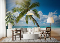 Bring the serenity of a tropical beach into your home with this refreshing wallpaper for walls. The bright blue sky and turquoise water create an open, airy feel, complemented by a single palm tree reaching towards the sun. The crisp white sand adds a clean, peaceful touch. This design works well in bathrooms, bedrooms, or living rooms, instantly turning them into calming retreats. Its light, vibrant colors create an invigorating, cheerful atmosphere, enhancing natural light and making the space feel larger.