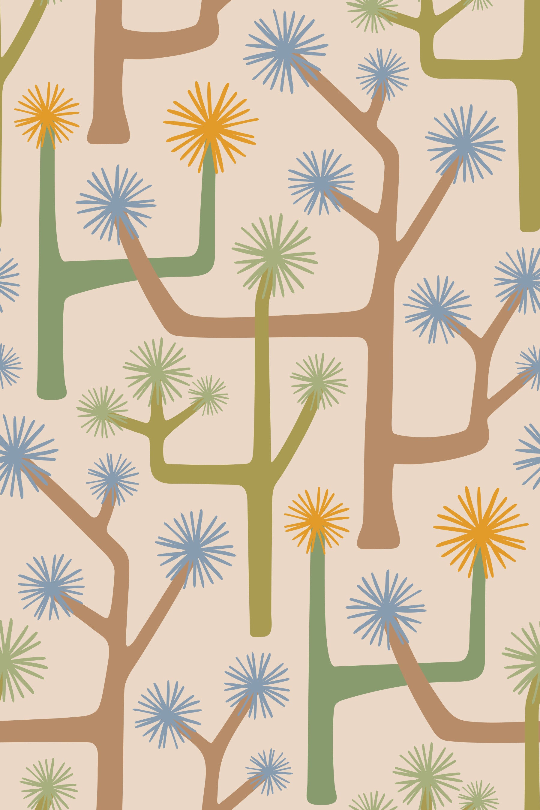 Evoke the warm sun-drenched spirit of the desert with this Joshua Tree wallpaper that draws inspiration from the iconic landscapes of Joshua Tree National Park, Mid-Century Modern design and Palm Springs style. Rendered in a palette of vintage-inspired hues, including brown, green, powder blue and mustard yellow on a warm cream background, "Joshua Tree" captures the essence of warm desert dunes. Clean lines and organic abstract shapes create a visually striking and timeless design, perfect for adding a touch of retro charm to any space, from living rooms and bedrooms to offices and studios. Let this wallpaper transport you to the cool, modern heart of the mid-century desert. This pattern design is also available in Other Colourways too! Original wallpaper pattern design by Jackie Tahara of UnBlink Studio.