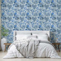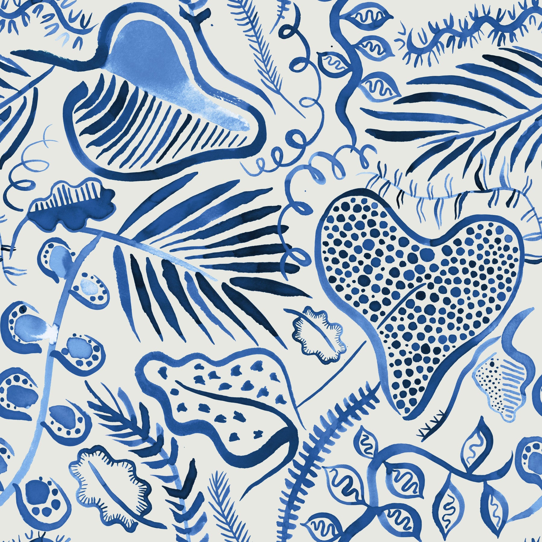 Immerse yourself in the serene beauty of 'Jungle Tropical Forest Leaves Blue'. This captivating wallpaper showcases a stylized watercolor design, featuring a vibrant palette of blues against a soft, off-white background. Intricate patterns of leaves, organic shapes, and swirling vines evoke a sense of lush, tropical tranquility. The artwork's abstract nature allows for a versatile aesthetic, perfect for modern and bohemian spaces alike. The cool, calming blue tones create a peaceful atmosphere, transforming any room into a tranquil oasis reminiscent of a deep jungle. The unique blend of artistic freedom and botanical inspiration makes this a striking and sophisticated wallpaper choice.