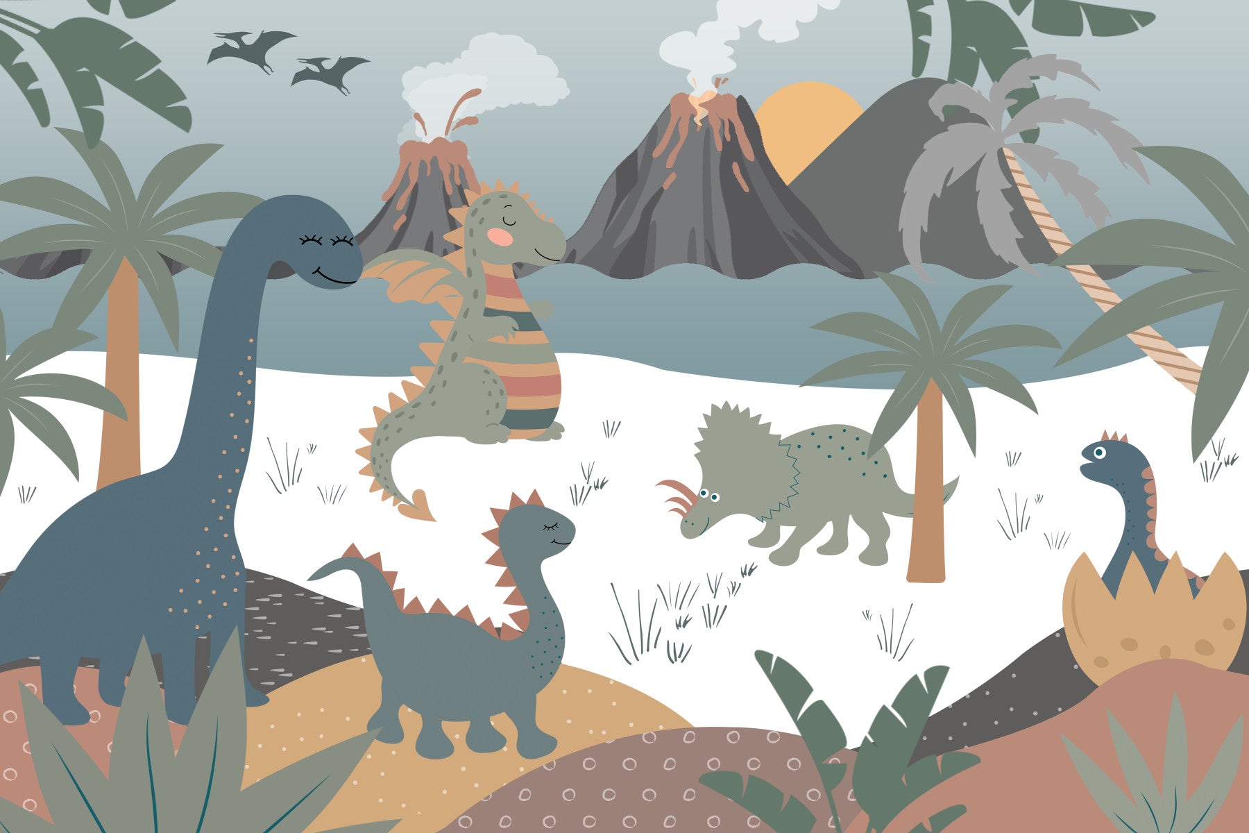 Bring the charm of the Mesozoic era into your home with this engaging design featuring adorable dinosaurs and lush jungle scenery. Soft hues of blue, green, and brown blend seamlessly to craft a tranquil and imaginative atmosphere. This charming wallpaper for walls is perfect for a child's bedroom or playroom, adding an element of fun and nature-inspired wonder. The delightful scene complements interiors with its lighthearted and creative touch, creating a space where imagination can soar.