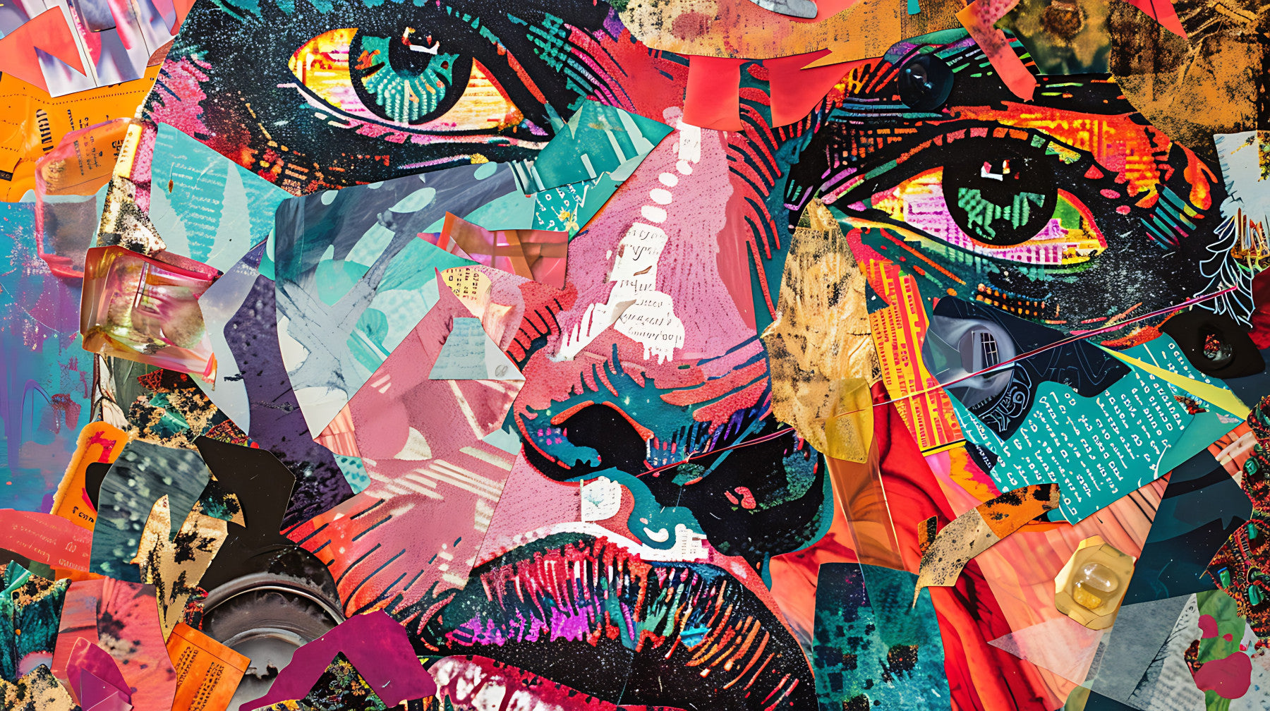 Elevate your décor with this kaleidoscope-inspired piece. This artwork presents a unique face through an intriguing collage design. The pattern merges various colorful paper scraps to create a compelling visual texture. Bright orange, pink, and black intertwine in a dynamic display. Use this fantastic wallpaper for walls to give personality to a trendy office or studio. Discover how this lively piece provides energy and goes perfectly with modern, eclectic interiors.