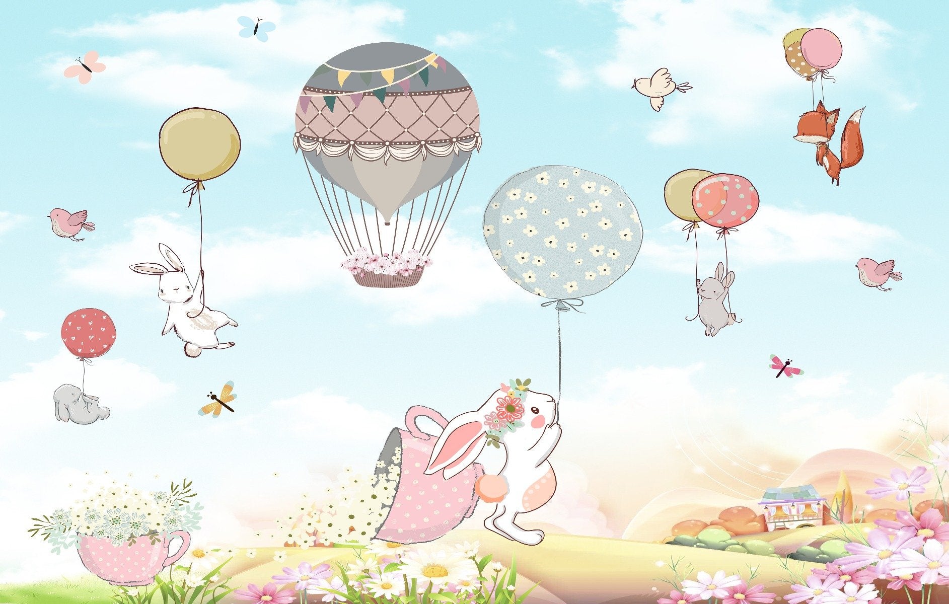 Brighten your child's space with our enchanting hot air balloon wallpaper mural, perfect for kids' rooms and baby nurseries. This charming design showcases joyful bunnies and squirrels floating skyward in colorful balloons, surrounded by delightful birds and butterflies. The soft pastel palette adds a touch of whimsy and warmth to the room, creating a playful and inviting atmosphere.
