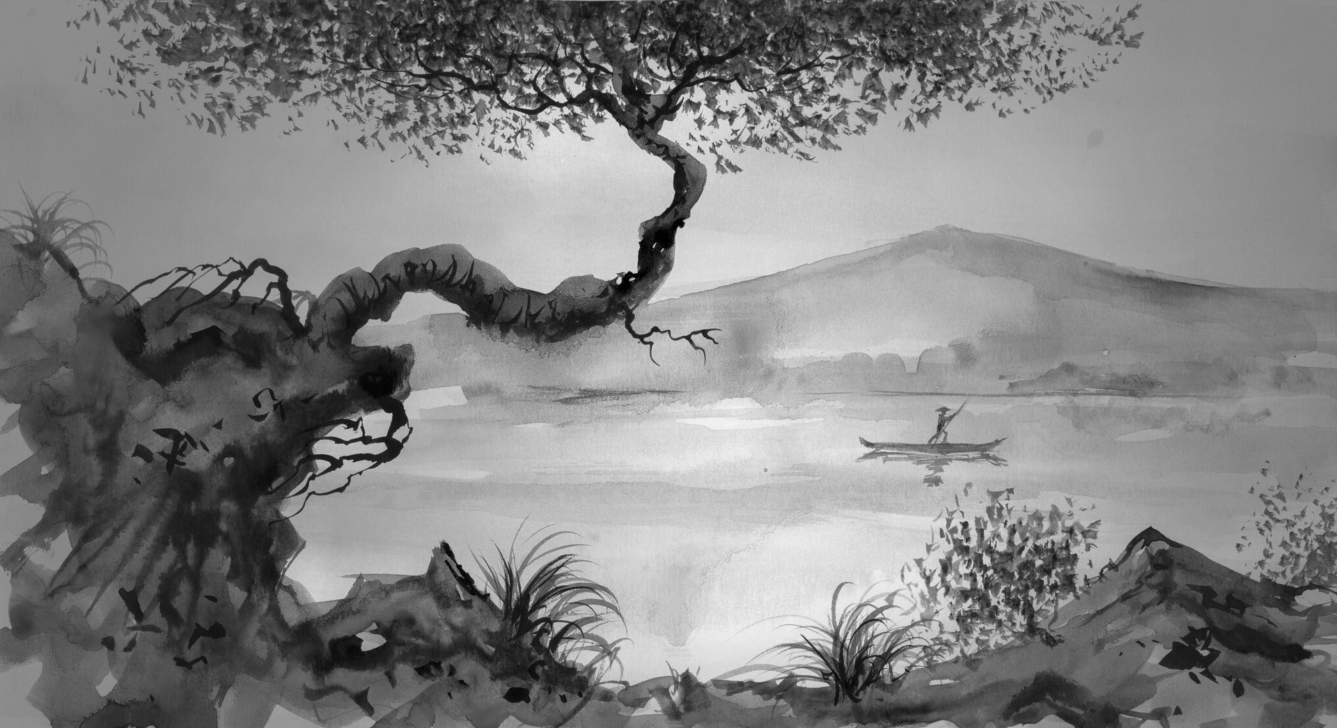 Transform your living space into a tranquil sanctuary with our watercolor brushstroke lakeside view wallpaper murals. Bask in the serenity of a gentle lake embraced by the subtle majesty of distant mountains, all captured through the delicate artistry of ink and watercolor. This mural, 'The View', is an ode to simplicity and elegance, featuring a palette of deep grey and off-white hues that will infuse your room with a peaceful, minimalist charm.