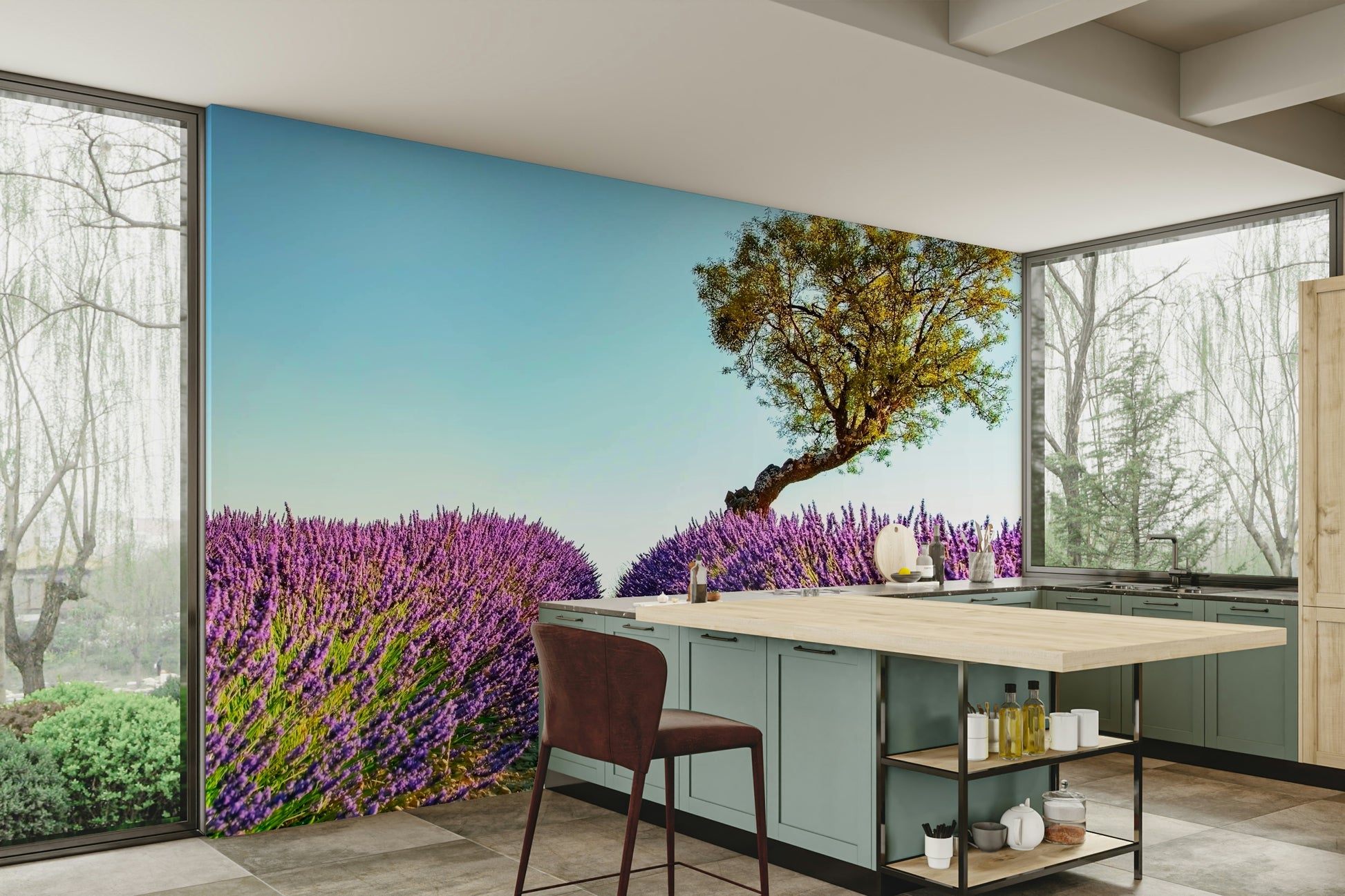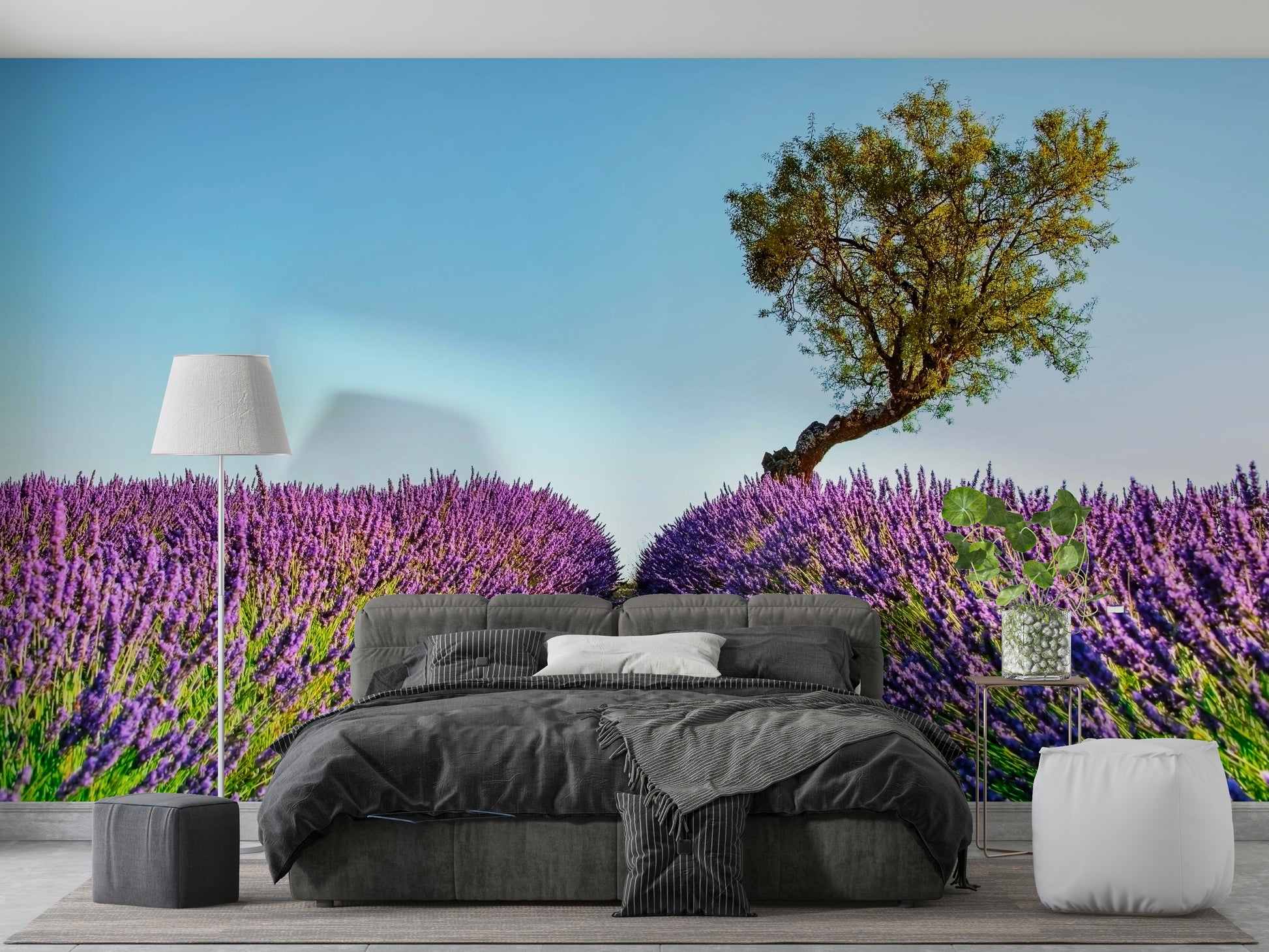 Drift away with this idyllic lavender field under a clear sky. Imagine walls dressed in soothing purples and greens. This scene adds a touch of the countryside to any room. The striking combination of the golden tree and blooming lavender creates a peaceful yet vibrant focal point. This wallpaper for walls brings nature indoors, perfect for a bedroom, living room, or study. The design transforms spaces into a serene escape, blending classic beauty with contemporary style. Enjoy the beauty of the Provence countryside every day.