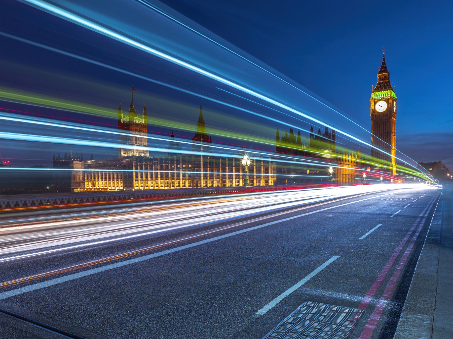 Westminster Abby and Big Ben with strip lights, London, UK. Capture the energy of London with this vibrant wallpaper for walls! The image shows the iconic Big Ben and Houses of Parliament, streaked with colorful light trails from passing traffic. The design offers a dynamic feel, ideal for a modern living room or a stylish home office. The contrasting golds and blues create a bold statement, adding urban sophistication to your interiors. Transform any room with this captivating cityscape.