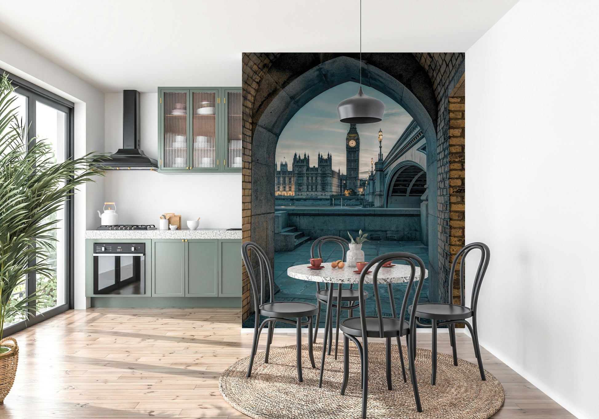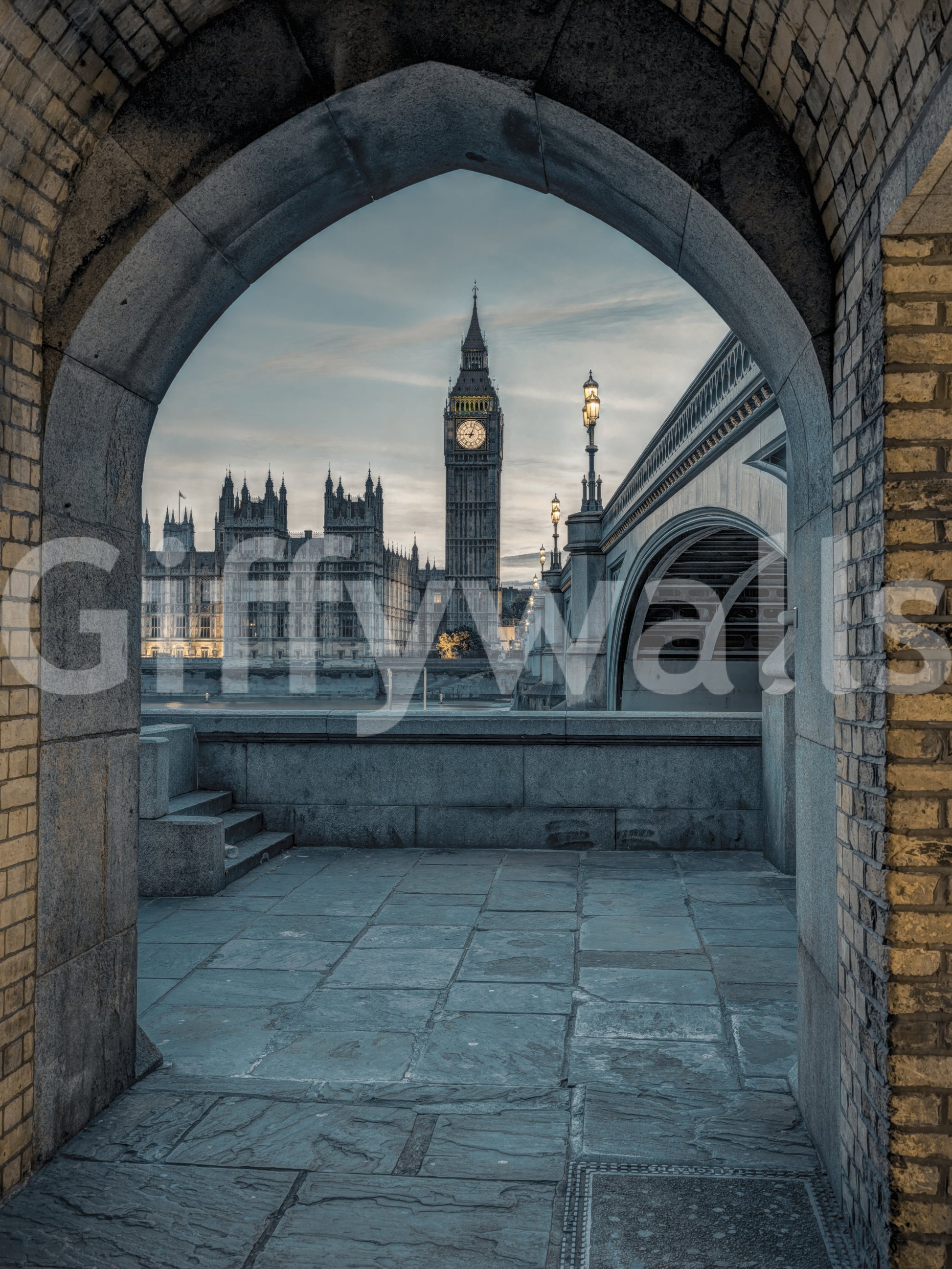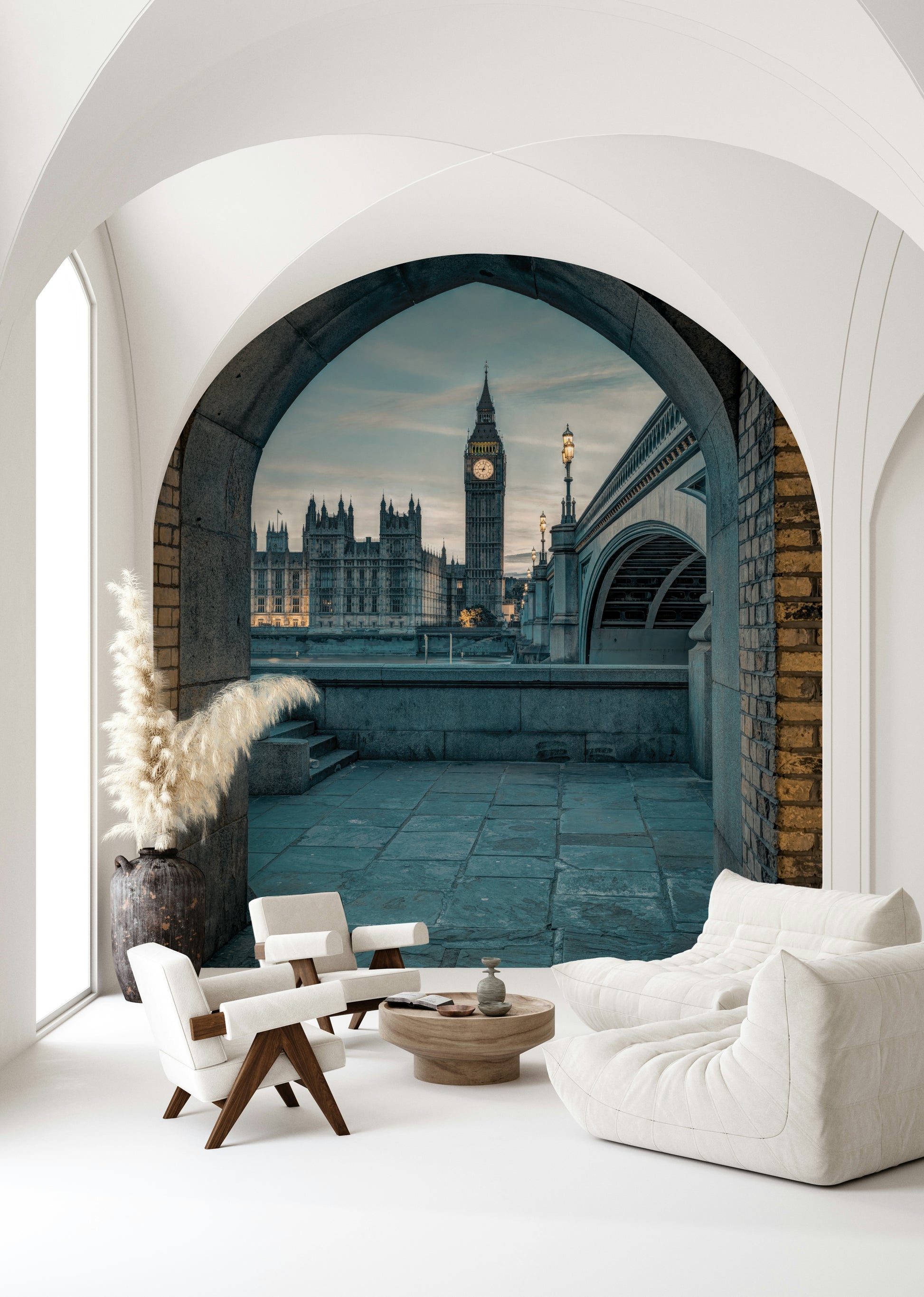 Capture the essence of London's historical charm with this captivating wallpaper for walls. The design frames iconic landmarks like Big Ben and the Houses of Parliament through a classic archway. Muted blues and grays create a calming atmosphere, enhanced by the warm glow of the street lamps. This image offers a sophisticated backdrop, ideal for a study, living room, or hallway. The timeless view brings a touch of British elegance and architectural interest to your home, blending beautifully with modern or classic interiors.