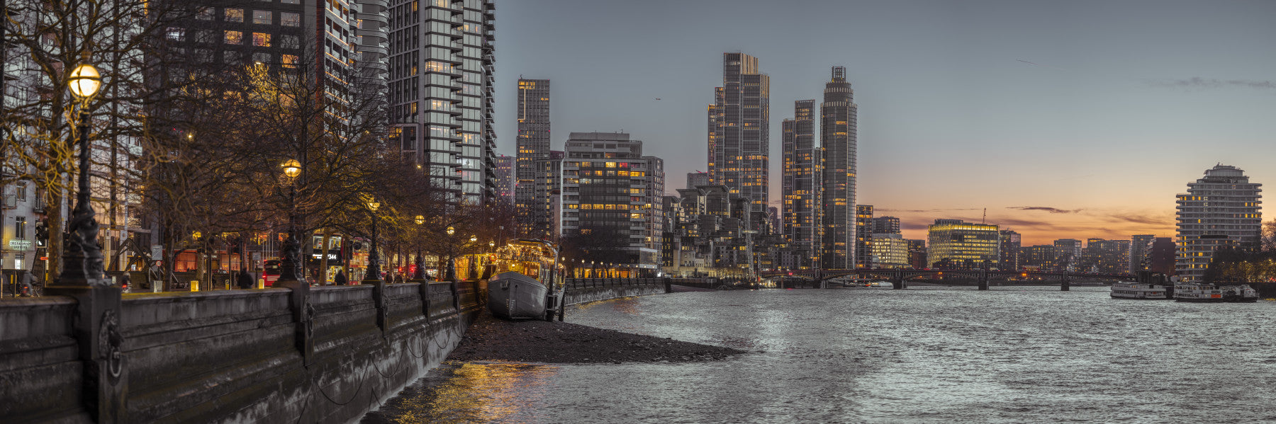 London cityscape over Thames river in evening. Capture the essence of London at dusk with this stunning city skyline wallpaper. Warm lights glow from modern skyscrapers, reflecting off the flowing river. The photograph brings an urban serenity indoors with a blend of grays, blues, and a subtle touch of orange in the sky. Perfect as wallpaper for walls in a living room, office, or bedroom, this design complements modern, contemporary, or minimalist interiors. It evokes a calm, sophisticated atmosphere with its detailed cityscape.