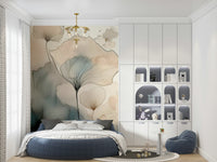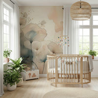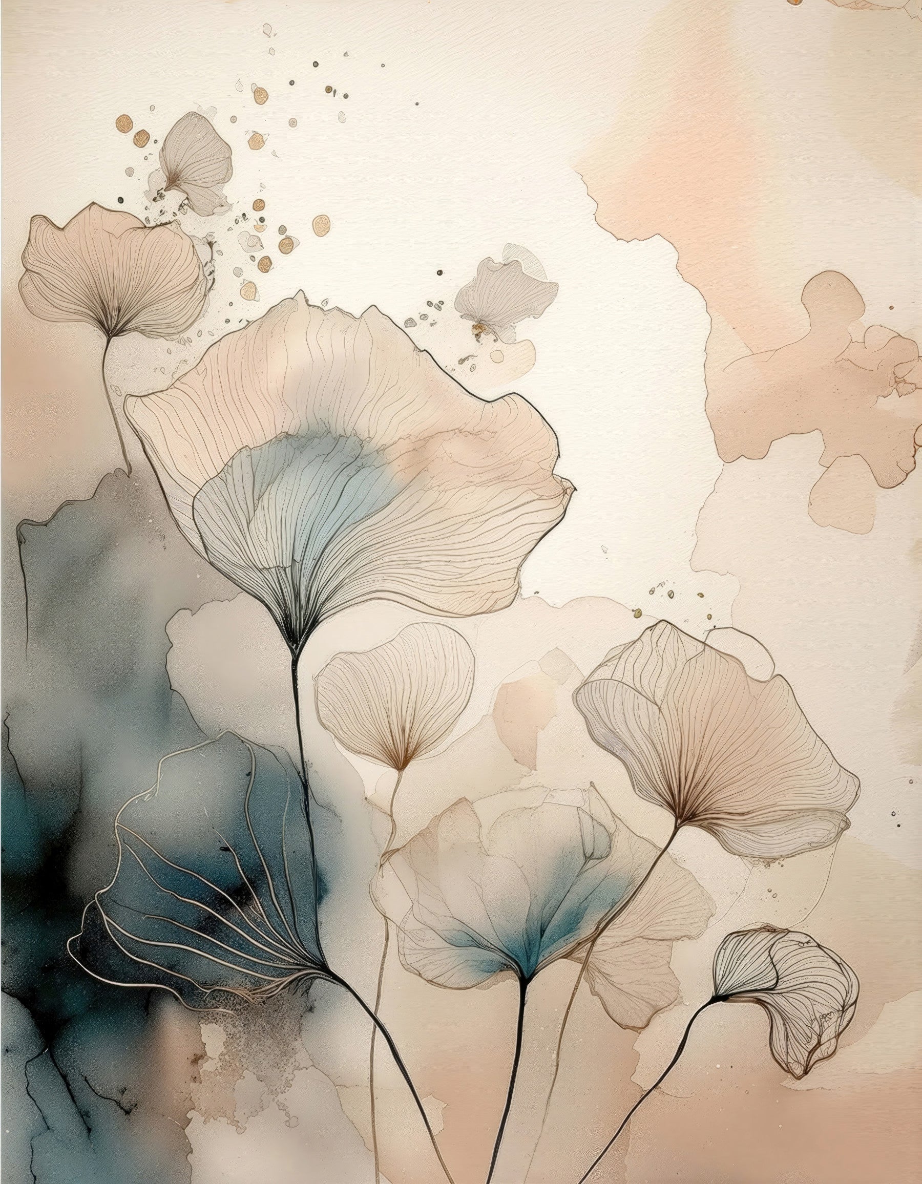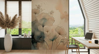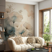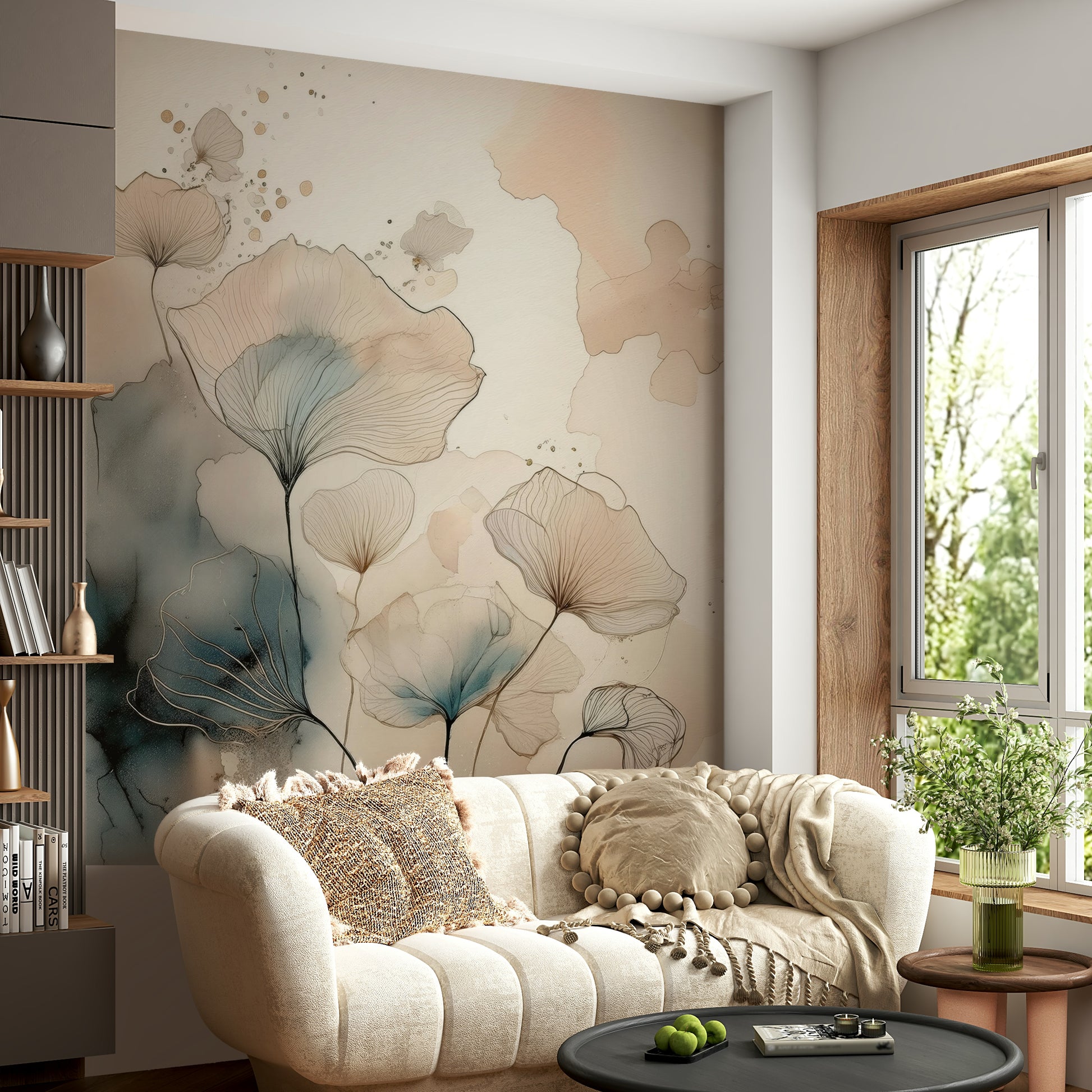 Elevate your interior with this artistic wallpaper for walls, showcasing delicate floral patterns in a watercolor style. The design features ethereal flower-like forms crafted with fine lines and soft watercolor washes. Gentle beige, peach, and muted blue hues lend a sophisticated and calm feel. Ideal for creating a peaceful bedroom, a stylish living room, or an inviting hallway. It enriches minimalist, modern, and classic spaces with its understated elegance.