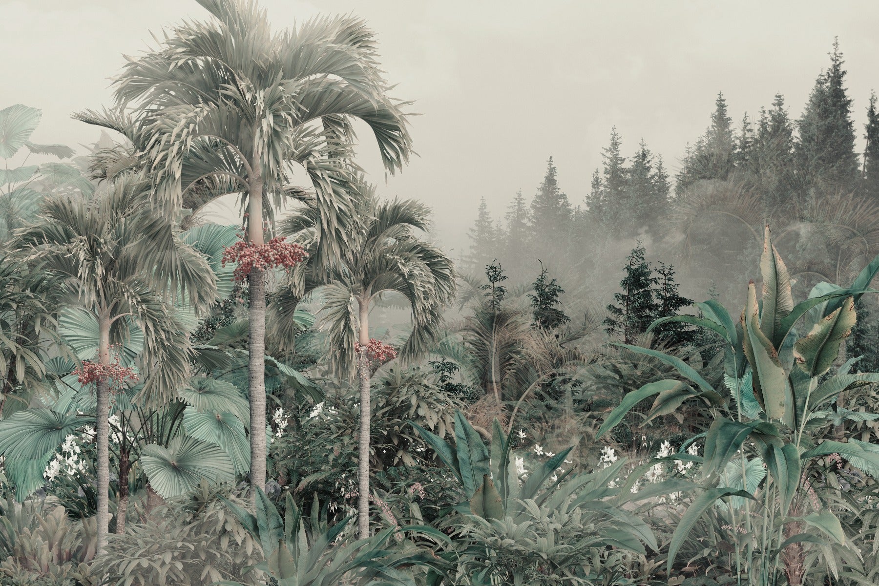 Discover the allure of nature with our Jungle Wallpaper Mural. Perfectly tailored for both moody maximalist and modern minimalist interiors, this mural brings the outside in. Our design showcases towering treetops, a serene rainforest landscape, and vivid dark green tropical leaves. Embrace the charm of lush green wallpaper in your living room, bedroom, or hallway.