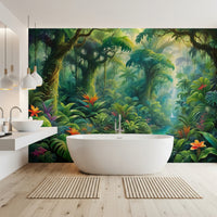 Bring the serenity of a verdant rainforest into your home with this visually stunning wallpaper for walls. The design features cascading greenery, vibrant orange blooms, and a peaceful stream, creating a calming oasis within your space. The rich palette of deep greens and vibrant hues invigorates any room, from living rooms and dining rooms to bedrooms. It infuses spaces with natural beauty and makes a wonderful statement piece. Perfect for creating an inviting and relaxing atmosphere, this wallpaper adds a touch of the wild to your home décor.