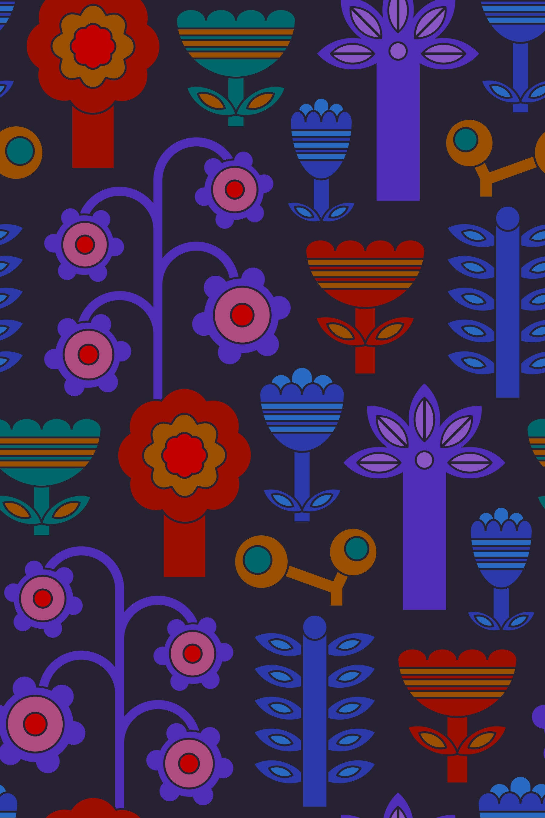 Magic Garden Retro Scandi Flowers Geometric Floral Jewel Brights Dark Wallpaper⁠