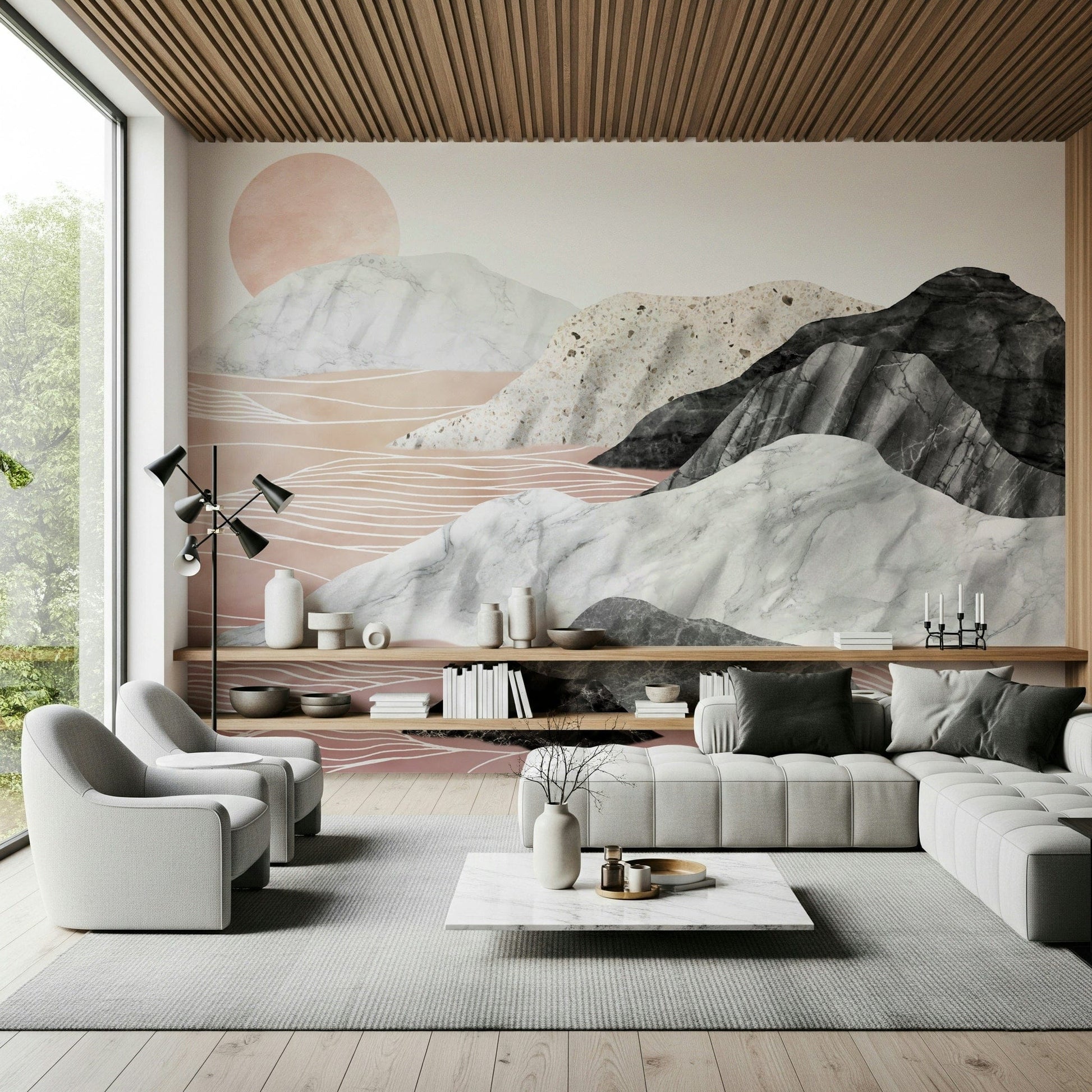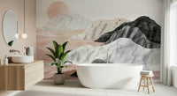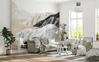 Invite serenity into your space with this sophisticated landscape wallpaper. Marble textures form mountain silhouettes, gently kissed by a soft sunset glow. Delicate white lines echo across blush pink valleys, creating a peaceful, dreamlike atmosphere. This wallpaper for walls adds a touch of modern elegance to bedrooms, living areas, or home offices. It blends beautifully with minimalist furniture and muted tones, bringing a calming presence to any room.