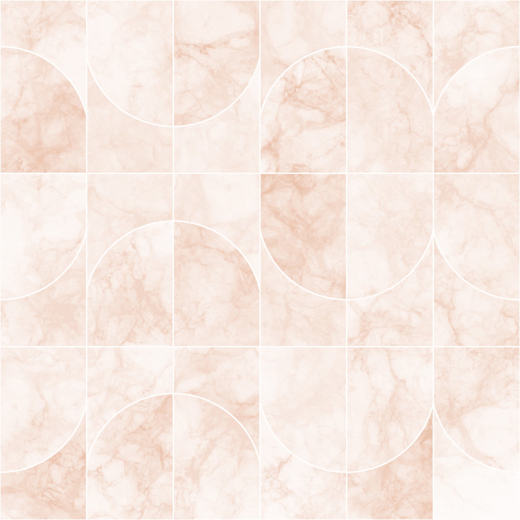 Immerse yourself in the understated elegance of Marbled Geo Tiles Pearlish. This wallpaper presents a sophisticated fusion of geometric precision and the organic beauty of marble. A delicate pearlescent hue washes over a grid of intricately veined marble tiles, creating a soft, luminous backdrop. Clean, crisp white lines delineate each square, punctuated by semi-circular motifs that subtly soften the overall structure. The harmonious blend of hard lines and flowing marble textures provides a visually compelling balance. Perfect for adding a touch of refined luxury to any space, 'Marbled Geo Tiles Pearlish' offers a calming yet captivating aesthetic, ideal for bedrooms, living areas, or even a stylish home office.