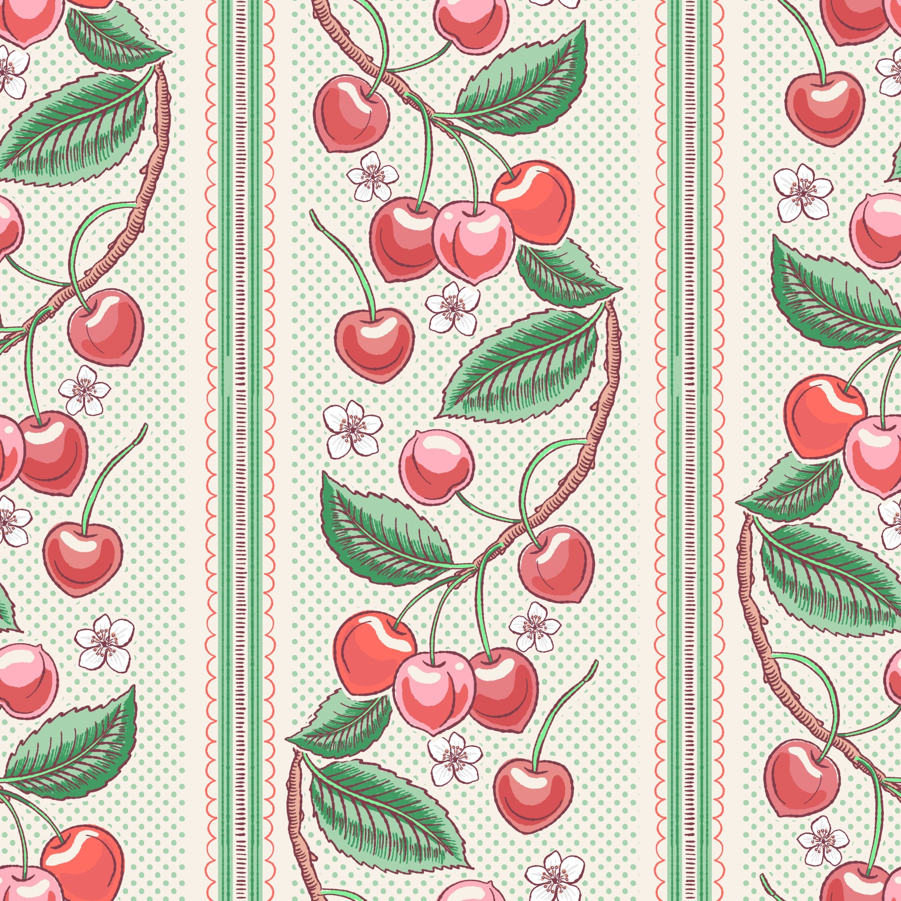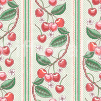 Embrace the festive cheer with this delightful wallpaper! 'Merry Cherry Red and Green Stripe' bursts with juicy red cherries, artfully arranged on branches adorned with vibrant green leaves and delicate white blossoms. The cheerful design is set against a charming pastel background featuring a subtle polka dot pattern, adding a touch of retro sweetness. Vertical stripes in merry cherry red and refreshing green, accented by scalloped edges, frame the cherry motifs, creating a beautifully balanced and eye-catching pattern perfect for adding a touch of holiday charm or all-year-round fruity freshness to your digital devices.